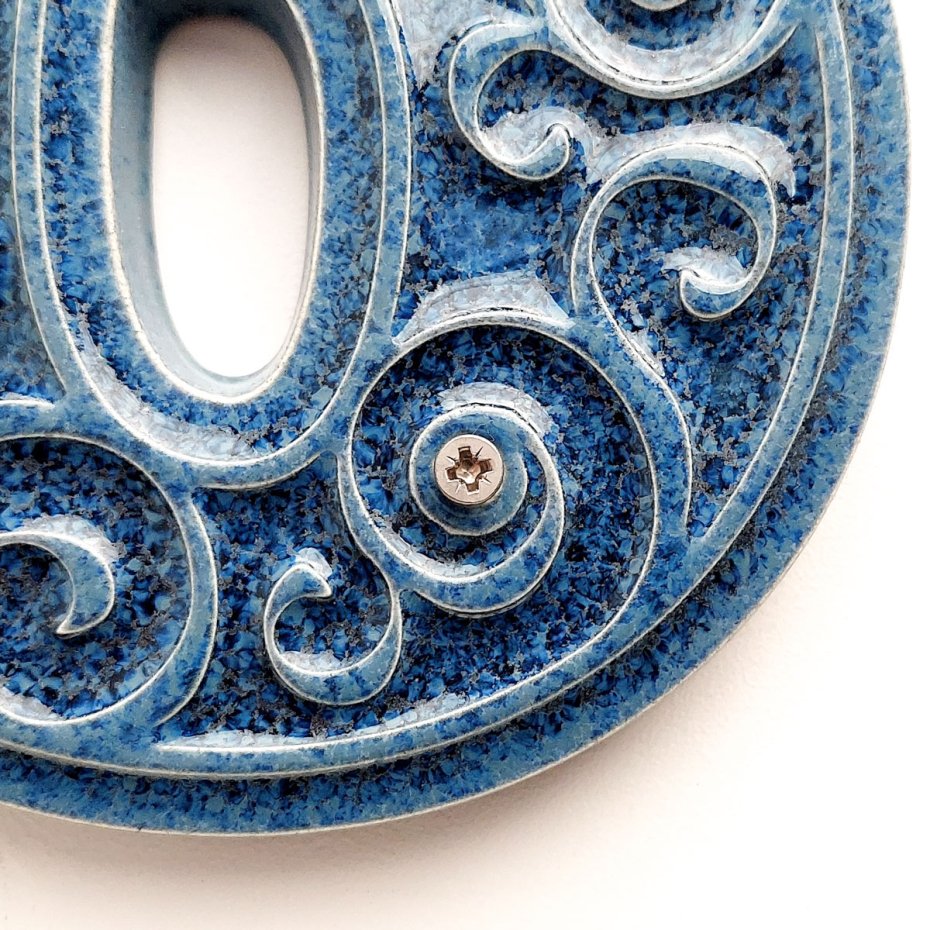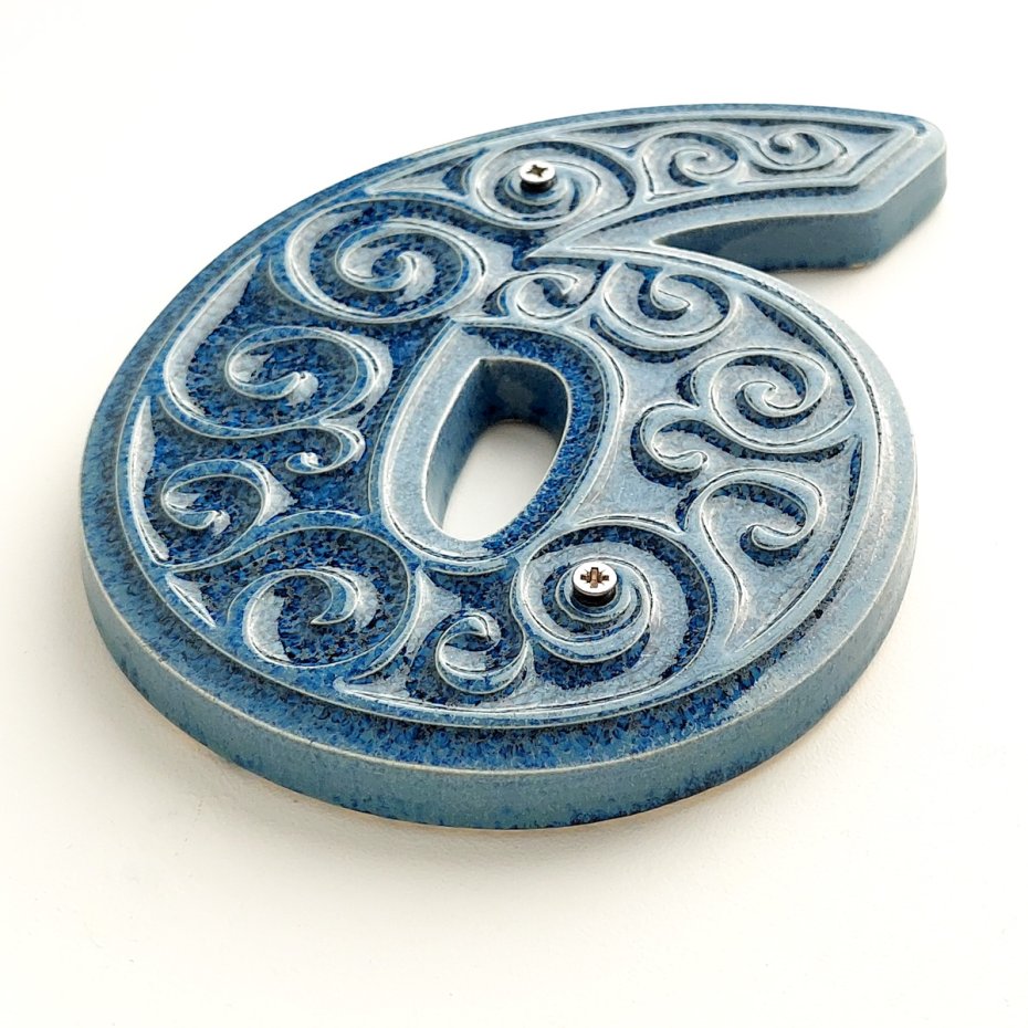 Ceramiczna cyfra z lekko wypukłym, dekoracyjnym ornamentem. Ręcznie wykonana z jasnej gliny, pokryta błyszczącym szkliwem. Dwukrotnie wypalana w wysokiej temperaturze.