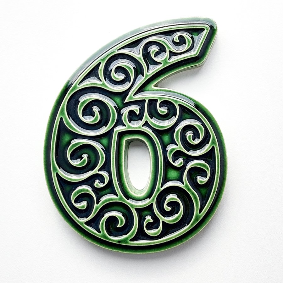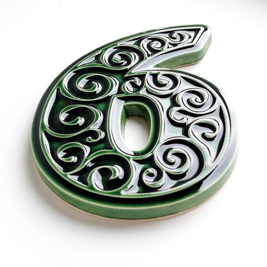 Ceramiczna cyfra 6 z ozdobnym lekko wypukłym ornamentem, do zamocowania na elewacji budynku. Wykonana z jasnej gliny, pokryta błyszczącym szkliwem, wypalona dwukrotnie w wysokiej temperaturze. Do klejenia cyfr można stosować kleje montażowe odporne na działanie warunków atmosferycznych. Unieruchomienie cyfry na czas schnięcia kleju umożliwia krawędziowy kołnierz od spodu cyfry. Polecam serdecznie.
