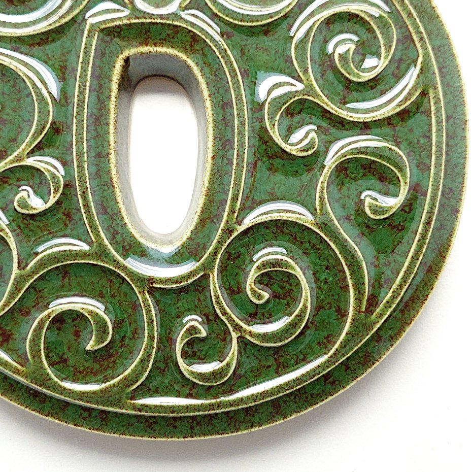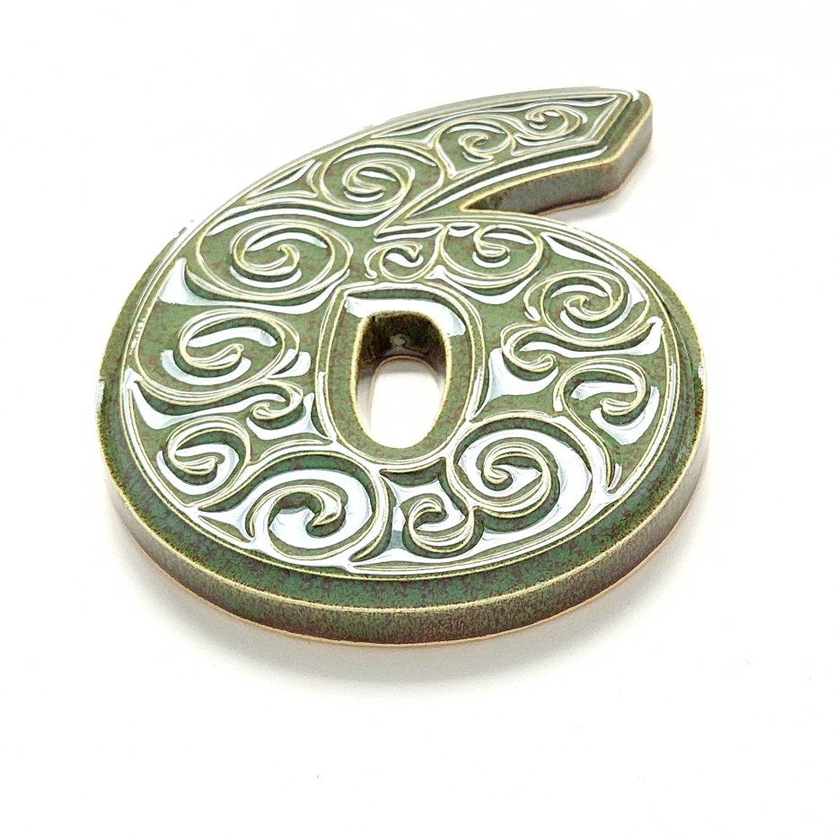 Ceramiczna cyfra 6 z ozdobnym lekko wypukłym ornamentem, do zamocowania na elewacji budynku. Wykonana z jasnej gliny, pokryta błyszczącym szkliwem, wypalona dwukrotnie w wysokiej temperaturze. Do klejenia cyfr można stosować kleje montażowe odporne na działanie warunków atmosferycznych. Unieruchomienie cyfry na czas schnięcia kleju umożliwia krawędziowy kołnierz od spodu cyfry. Polecam serdecznie.