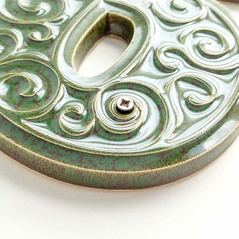 Ceramiczna cyfra z lekko wypukłym, dekoracyjnym ornamentem. Ręcznie wykonana z jasnej gliny, pokryta błyszczącym szkliwem. Dwukrotnie wypalana w wysokiej temperaturze.