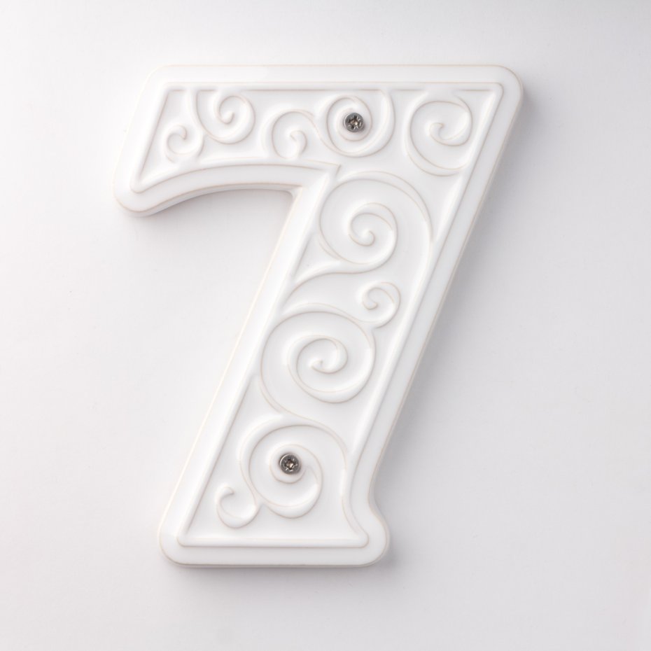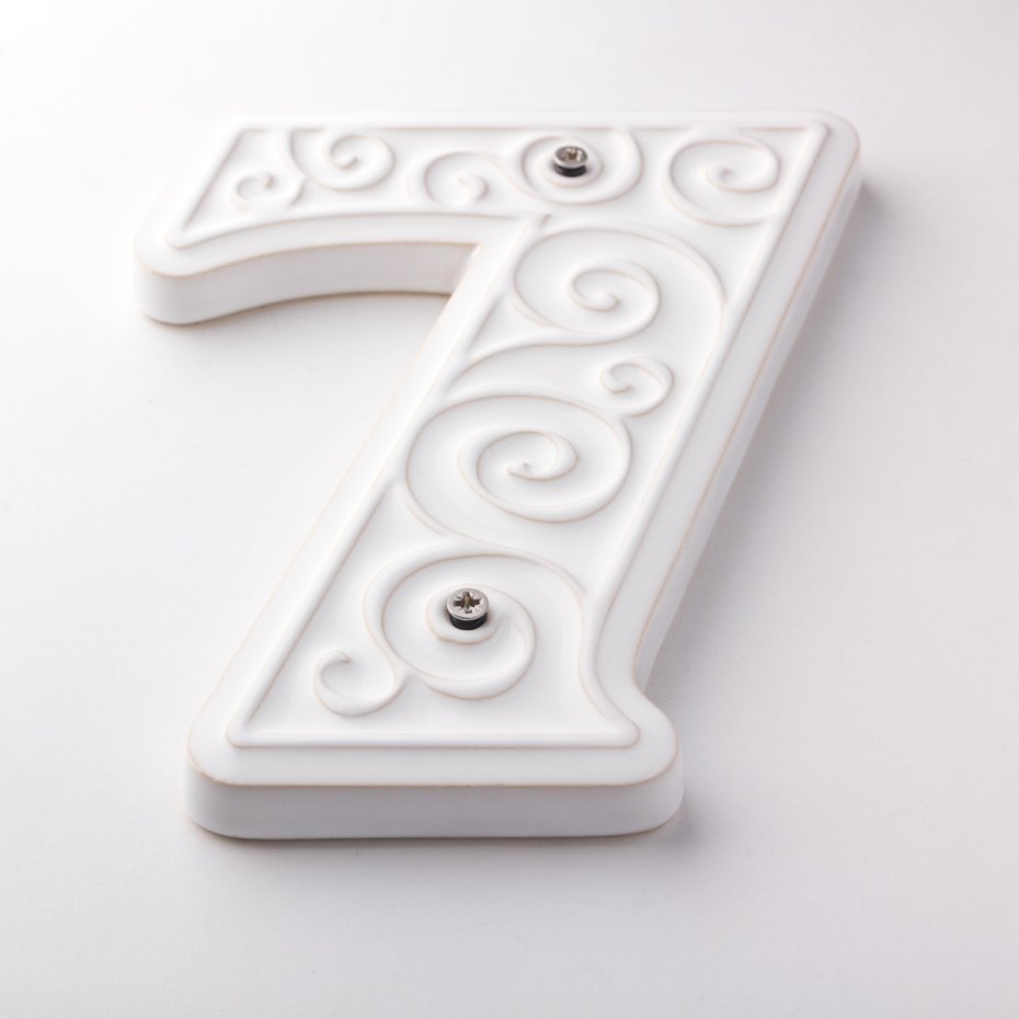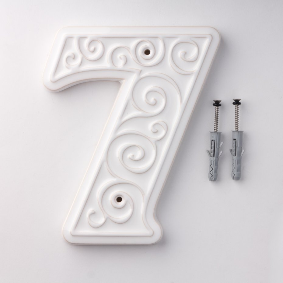 Ceramiczna cyfra z lekko wypukłym, dekoracyjnym ornamentem. Ręcznie wykonana z jasnej gliny, pokryta błyszczącym szkliwem. Dwukrotnie wypalana w wysokiej temperaturze.