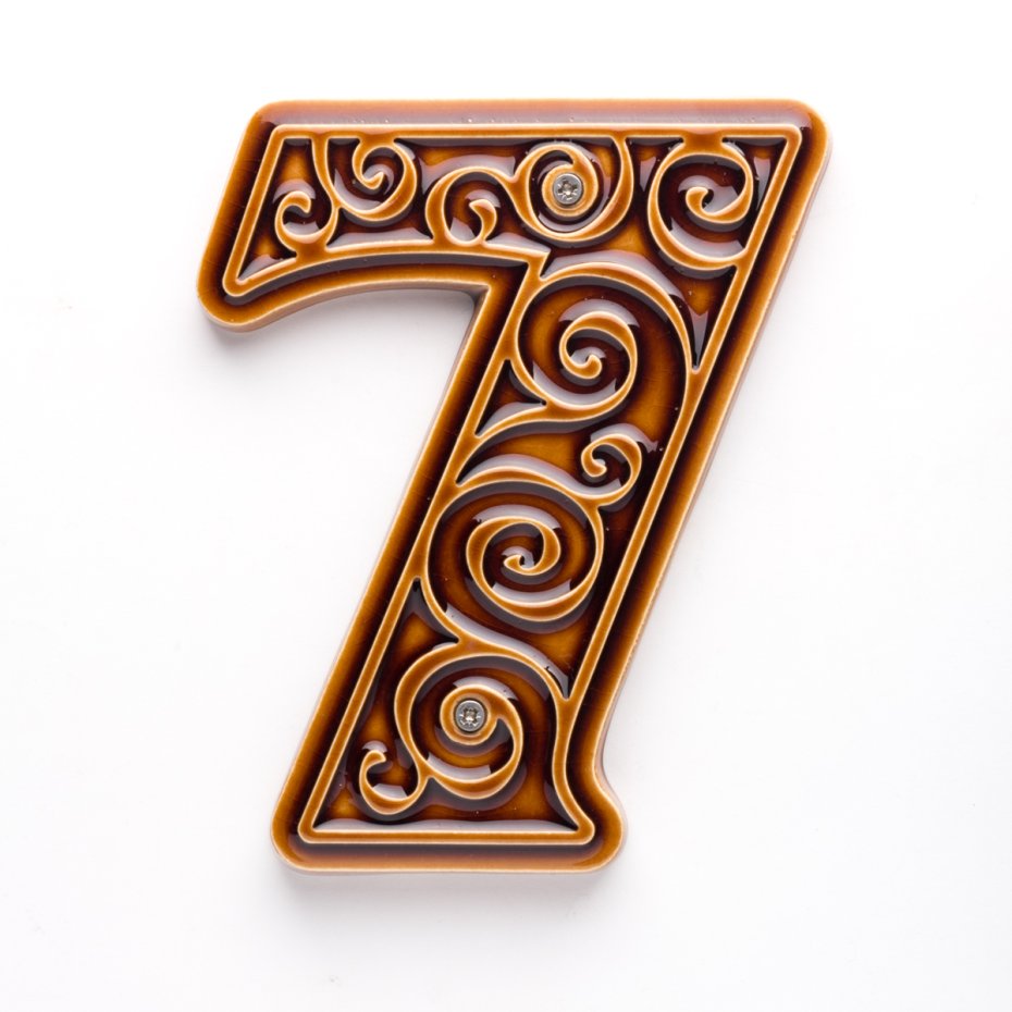 Ceramiczna cyfra z lekko wypukłym, dekoracyjnym ornamentem. Ręcznie wykonana z jasnej gliny, pokryta błyszczącym szkliwem. Dwukrotnie wypalana w wysokiej temperaturze.