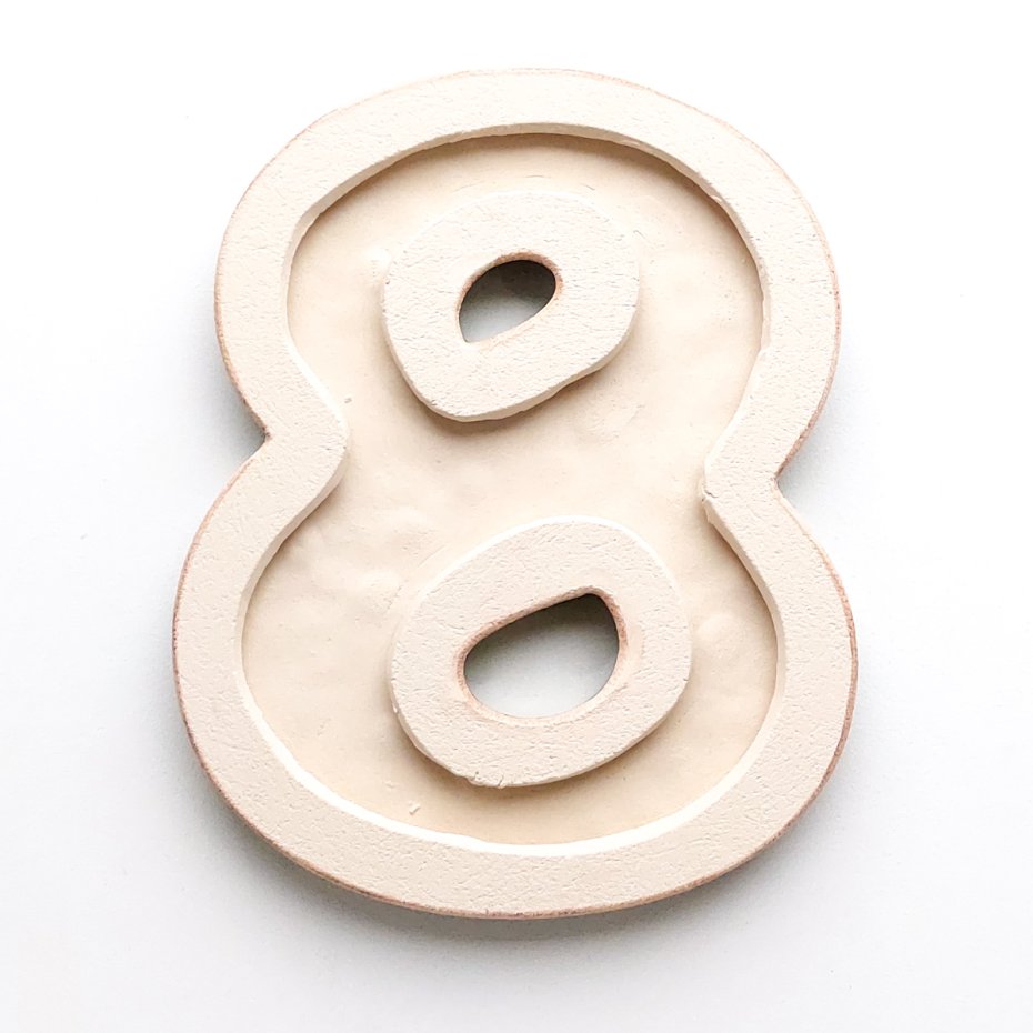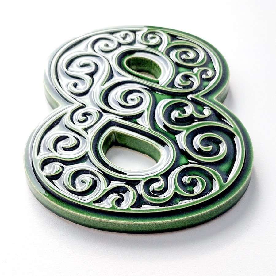 Ceramiczna cyfra 8 z ozdobnym ornamentem, do zamocowania na elewacji budynku. Ręcznie wykonana z jasnej gliny i ręcznie szkliwiona, wypalona dwukrotnie w wysokiej temperaturze. Do klejenia polecam kleje montażowe odporne na działanie warunków atmosferycznych. Unieruchomienie cyfry na czas schnięcia kleju umożliwia krawędziowy kołnierz od spodu cyfry, ułatwiający jej zawieszenie np.na kołku.