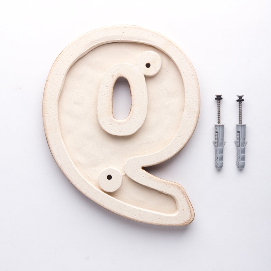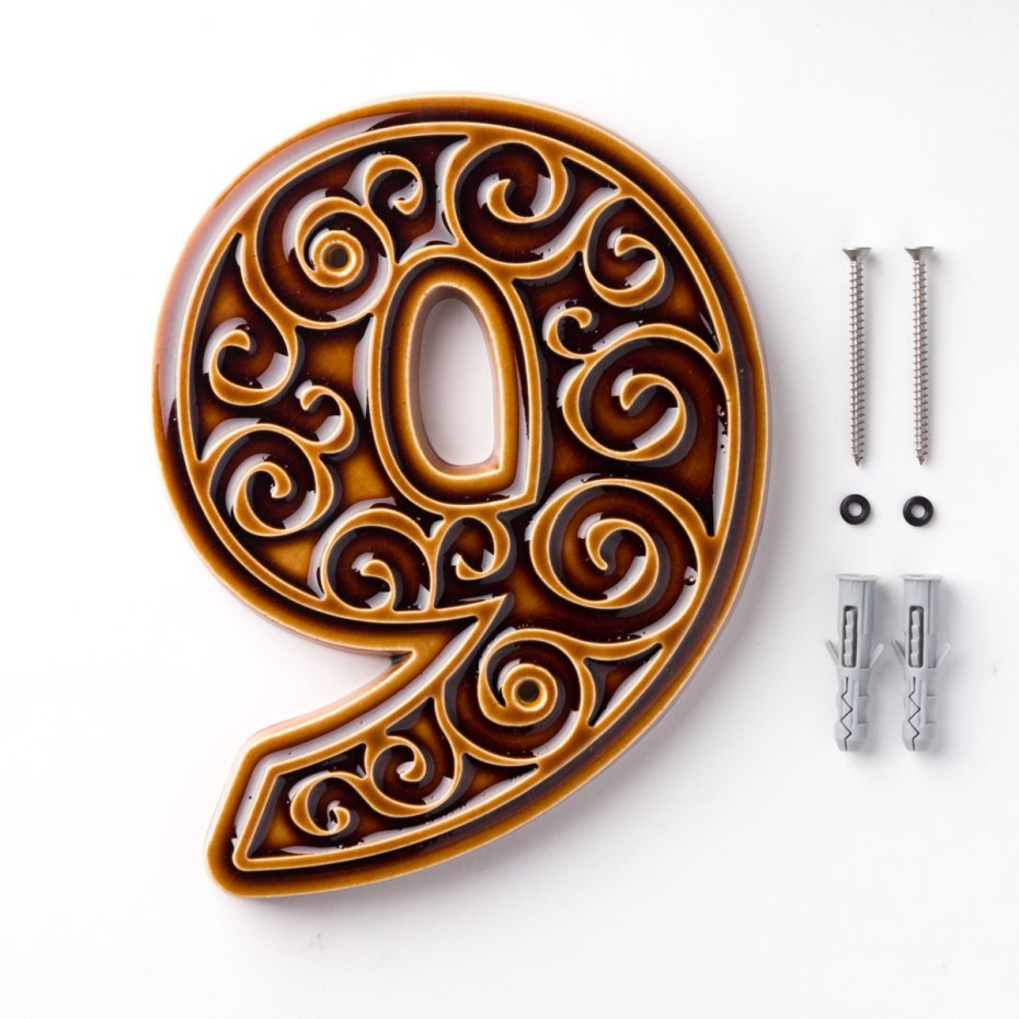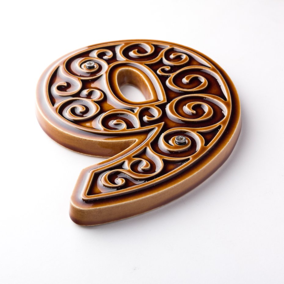 Ceramiczna cyfra z lekko wypukłym, dekoracyjnym ornamentem. Ręcznie wykonana z jasnej gliny, pokryta błyszczącym szkliwem. Dwukrotnie wypalana w wysokiej temperaturze.