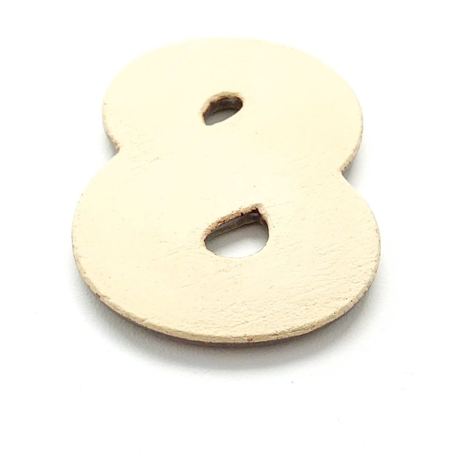Ceramiczna cyfra 8 z ozdobnym, lekko wypukłym ornamentem, do zamocowania na drzwi mieszkania lub domu. Wykonana z jasnej gliny, pokryta błyszczącym szkliwem. Dwukrotnie wypalana w wysokiej temperaturze.