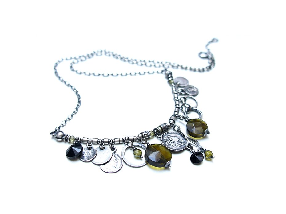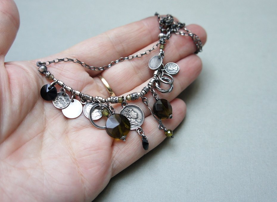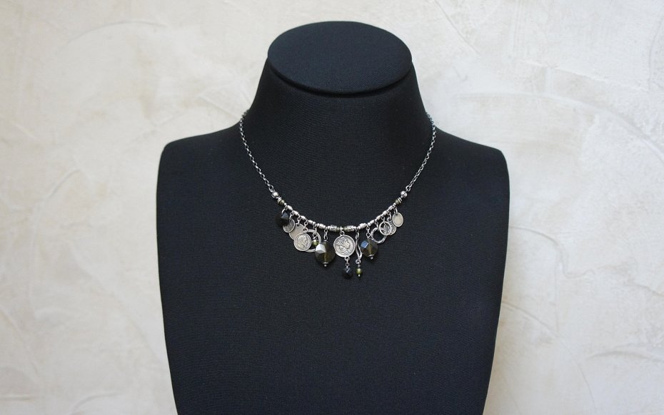 Naszyjnik wykonany ze srebra [pr. 925] w połączeniu z fasetowanymi monetkami kwarców [12mm i 10mm] ,kryształkami Swarovski [8mm i 6mm] ,cyrkoniami [4mm i 3mm] oraz srebrnymi blaszkami, ogniwami i imitacjami monet. Srebro oksydowane i przetarte. Całkowita długość naszyjnika 44cm. Biżuteria ozdobnie zapakowana