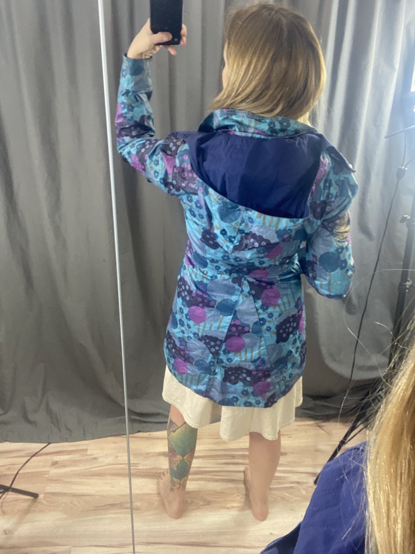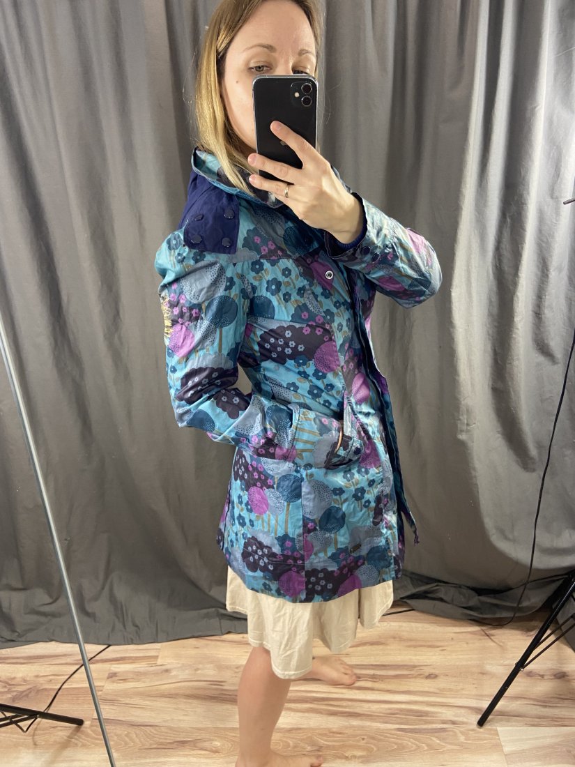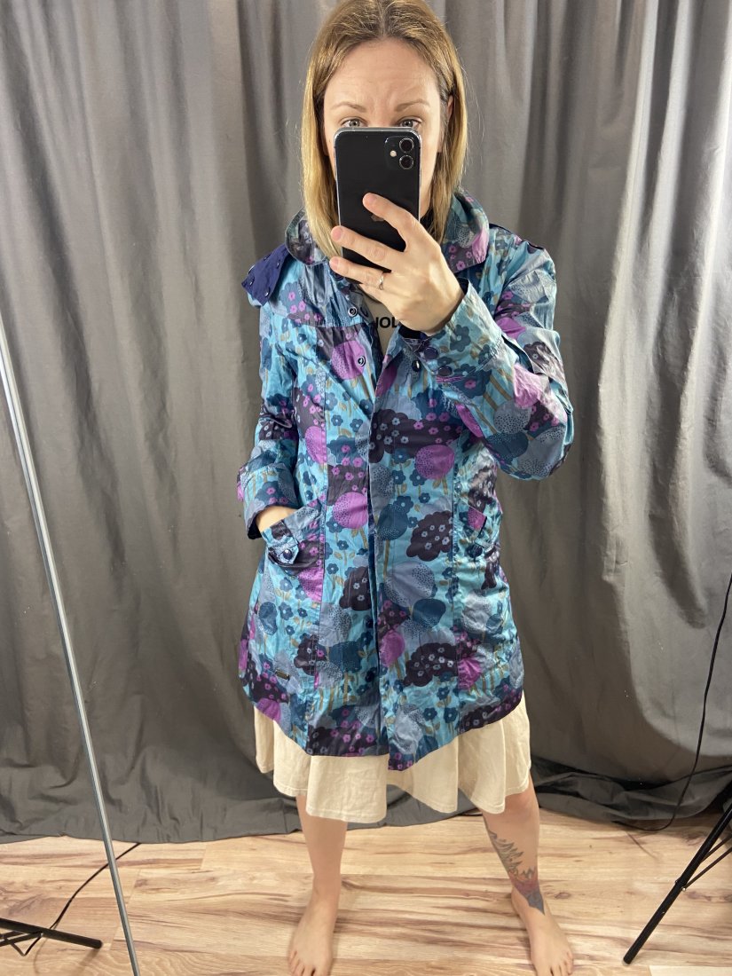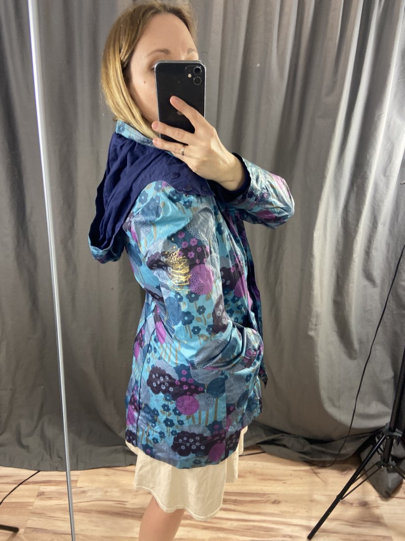 Lekki płaszczyk z warstwą przecideszczową, z bawełnianą podszewką. Kaptur odpinany.