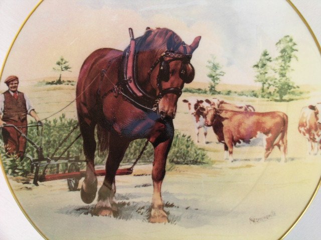 Fantastyczny talerz porcelanowy, na błyszcząco szkliwiony, sygnowany, z nadrukiem konia pociągowego i doskonałym opisem jego zalet na rewersie - tekst wręcz urzeka prostotą i serdecznością :) Rant złocony. Talerz pół-głęboki. 19,5 x 3 cm. Stan zachowania bardzo dobry.