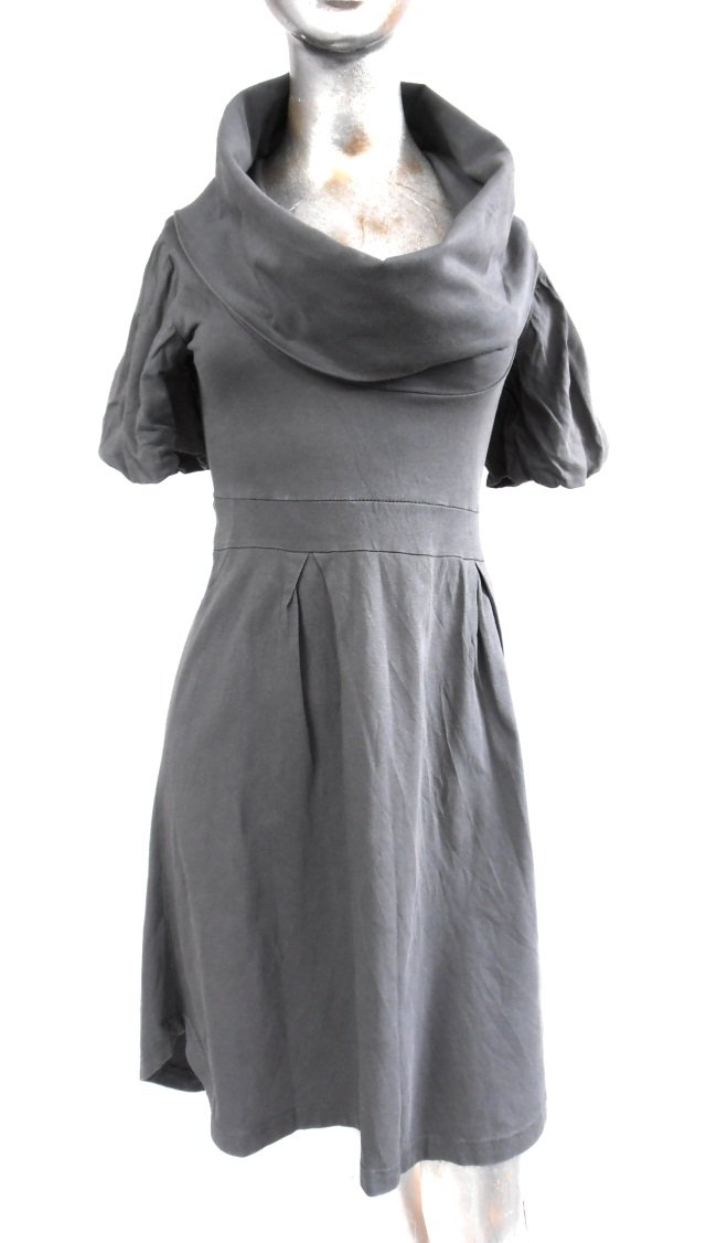 Szara sukienka z dużym golfem,firmy OBJECT.Rozmiar S.Materiał bawełna.Tył nieco dłuższy.Odcięta pod biustem z wszytym pasem.Dól z czterema kontrafałdami.Rękaw krótki,koniec wciągnięty do wewnątrz przez podszewkę.W bok wszyte pomarańczowe logo firmy.Stan dobry,lekko sprana.Długość tyłu 98 cm.przodu 82 cm.Pod pachami 88 cm.
