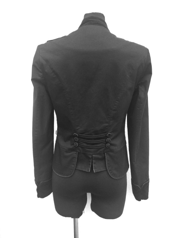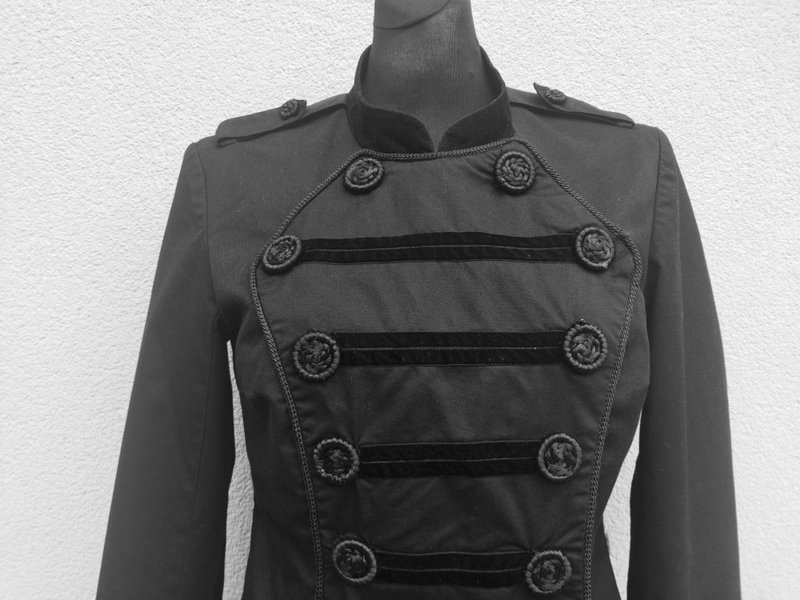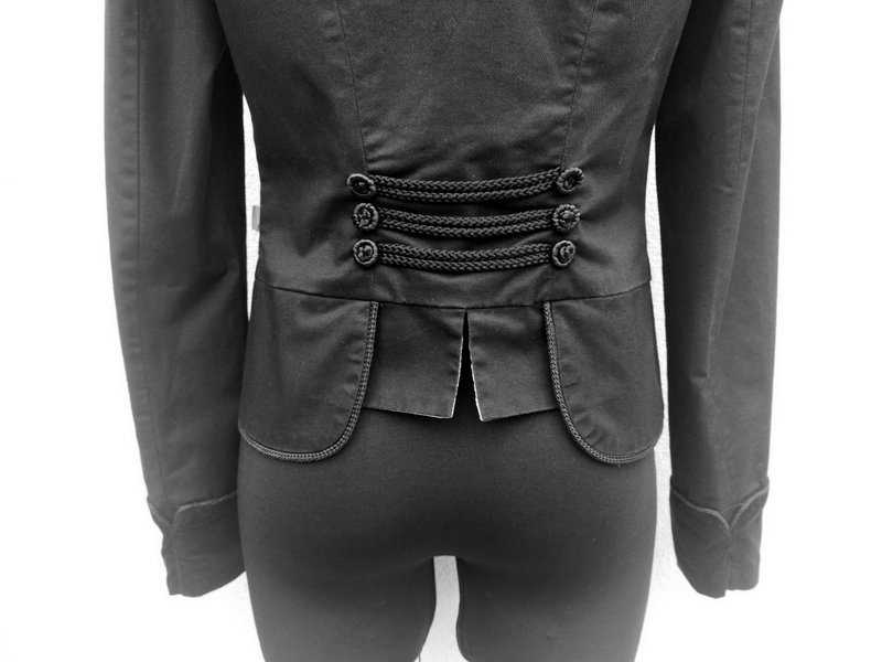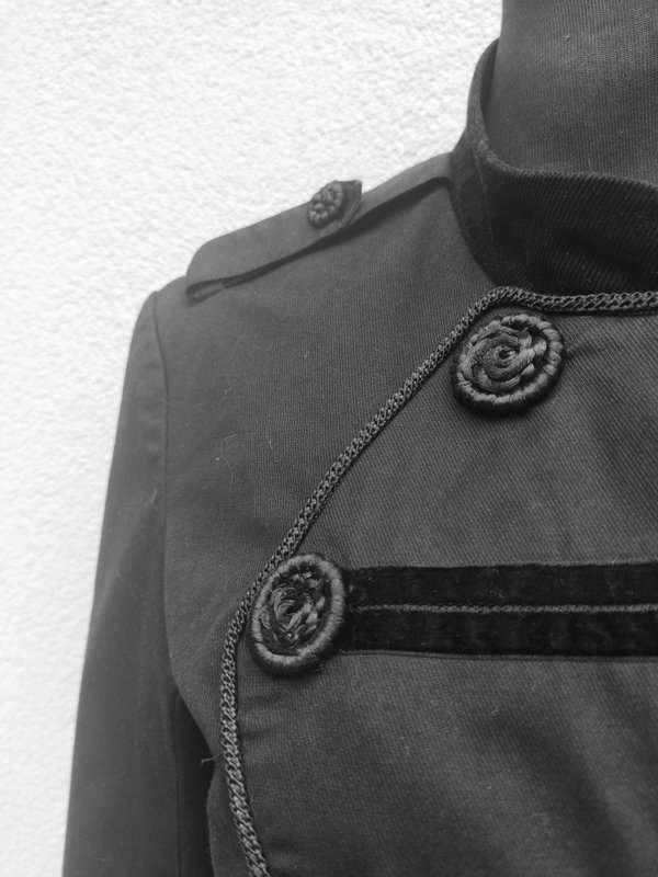 Marynarka lub kurtka o ciekawym kroju z bawełnianej tkaniny w czarnym kolorze, stójka i mankiety rękawów z drobnego sztruksu. Starannie uszyta z licznymi detalami. Wykończona lamówkami z czarnego sznureczka, z ozdobną imitacją zapięcia na oblekane tasiemką guziki naszywane na łączących je aksamitnych tasiemkach- właściwe zapięcie od wewnątrz na metalowe zatrzaski, na ramionach pagony z guzikami , u dołu u baskinka z dwiema wpuszczanymi kieszonkami z guzikami, z tyłu trzy podwójne sznureczki połączone oblekanymi guzikami. Całość na podszewce.