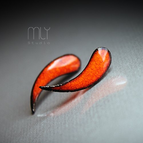 Ceramiczne podłużne kolczyki, ręcznie wykonane z delikatnej gliny kamionkowej, jednostronnie szkliwione mieszanką pomarańczowych szkliw z efektem plamek, tył matowy czekoladowobrązowy na antyalergicznych sztyftach w kolorze srebrnym.długość ok 3cm. Polecam