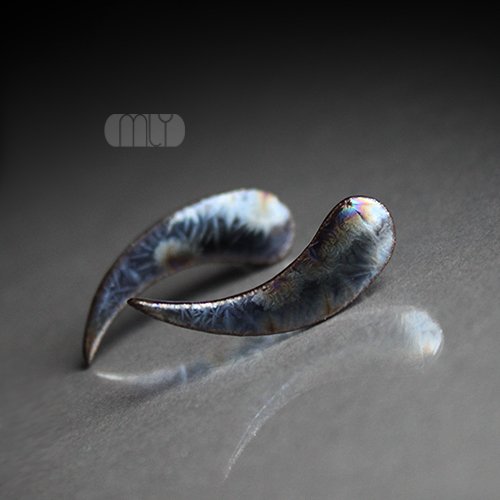 Ceramiczne podłużne kolczyki, ręcznie wykonane z delikatnej gliny kamionkowej, jednostronnie szkliwione mieszanką szarych szkliw z efektem plamek, tył matowy czekoladowobrązowy na antyalergicznych sztyftach.długość ok 2,8cm. Polecam