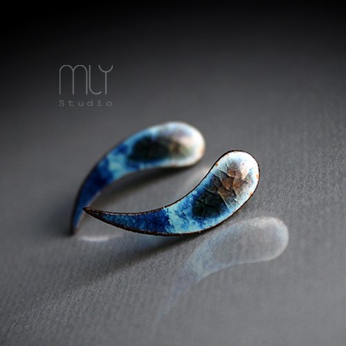 Ceramiczne podłużne kolczyki, ręcznie wykonane z delikatnej gliny kamionkowej, jednostronnie szkliwione mieszanką błękitnych i beżowych szkliw z efektem plamek, tył matowy czekoladowobrązowy na antyalergicznych sztyftach.długość ok 2,8cm. Polecam