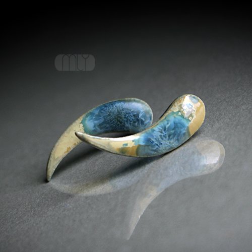 Ceramiczne podłużne kolczyki, ręcznie wykonane z delikatnej gliny kamionkowej, jednostronnie szkliwione mieszanką błękitnych i beżowych szkliw z efektem plamek, na antyalergicznych sztyftach.długość ok 2,8cm. Polecam