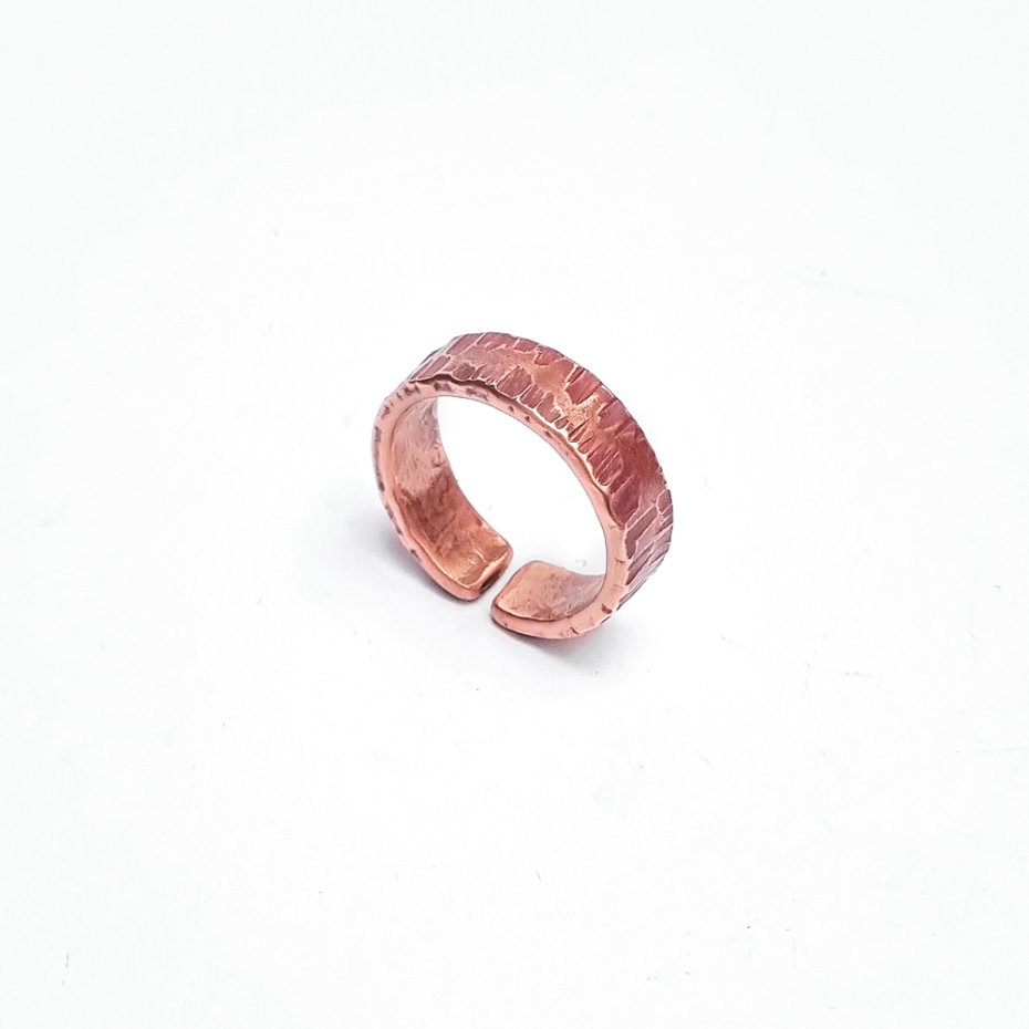 Obrączka wykonana z czystej miedzi (99,9% Cu), ręcznie kuta i fakturowana młotkami. Naturalna oksyda ogniowa, ręczne przecieranie. Możliwość lekkiej regulacji. Inne rozmiary na zamówienie.