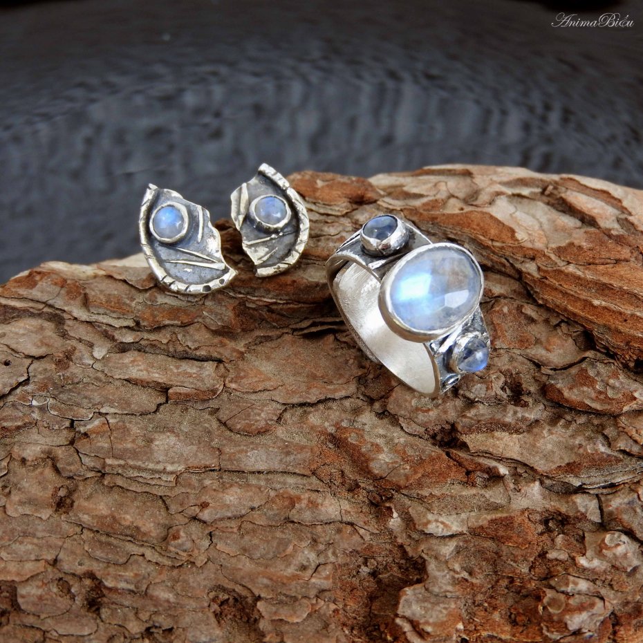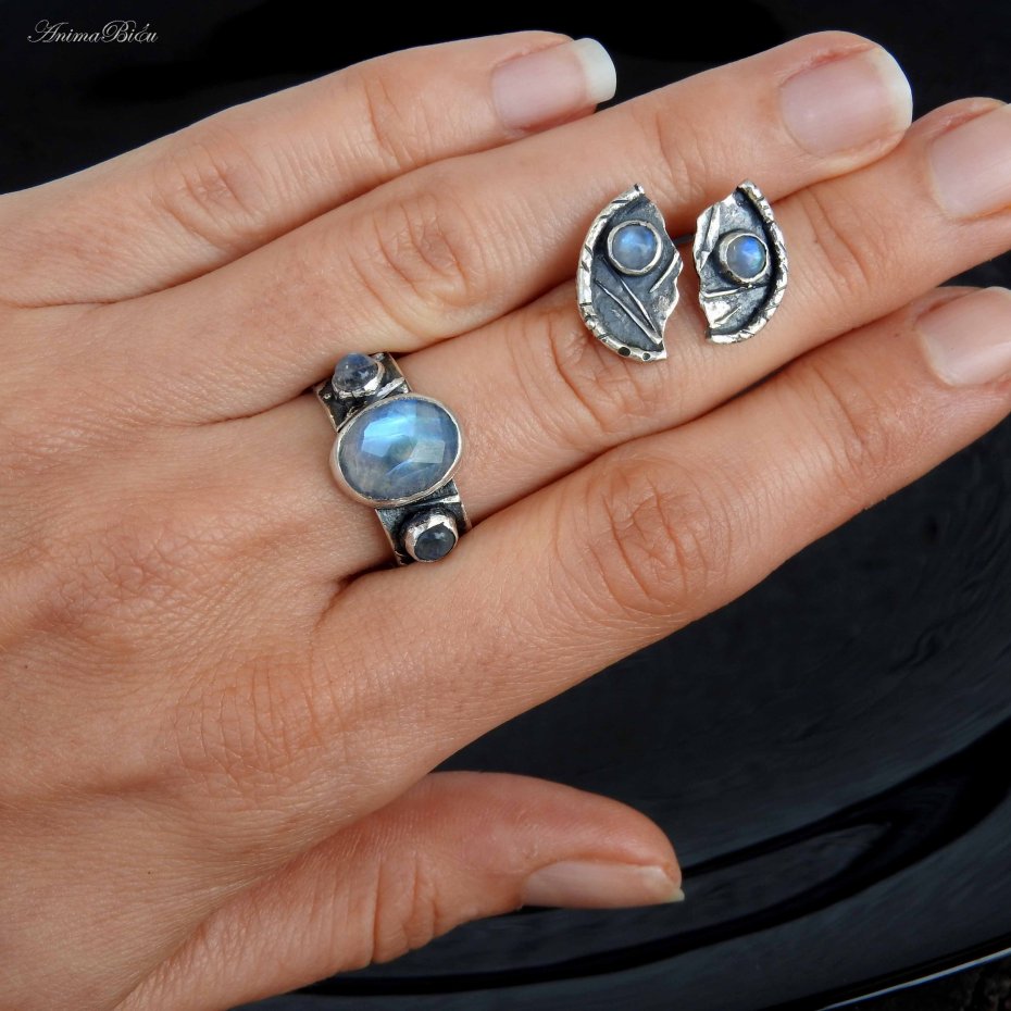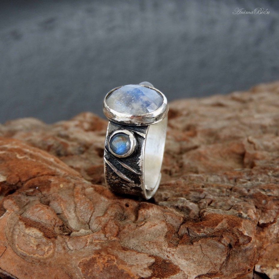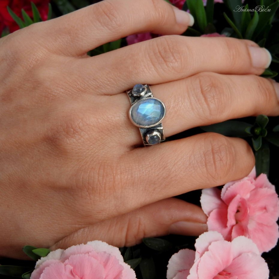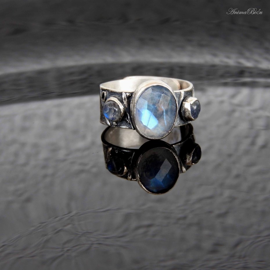 Obrączka srebrna z kamieniami księżycowymi. Obrączkę wykonałam od podstaw ręcznie ze srebra próby 925, 999, które fakturowałam, oksydowałam i przetarłam. Sercem pierścionka jest owalny kamień księżycowy o bajecznej, błękitnej poświacie, którą dodatkowo podkreślają liczne fasetki na powierzchni minerału. Towarzystwa dotrzymują mu dwa okrągłe, malutkie kamienie księżycowe umieszczone po bokach. Obrączka ma szerokość 8 mm. Jej rozmiar jest regulowany, przy zakupie proszę o podanie informacji jaki rozmiar mam ustawić. Technika wykonania: lutowanie, młotkowanie. Waga 6,5 g, w tym srebro 5,8 g. Korona ma rozmiar 13 na 9 mm. Cechowana w Urzędzie Probierczym.