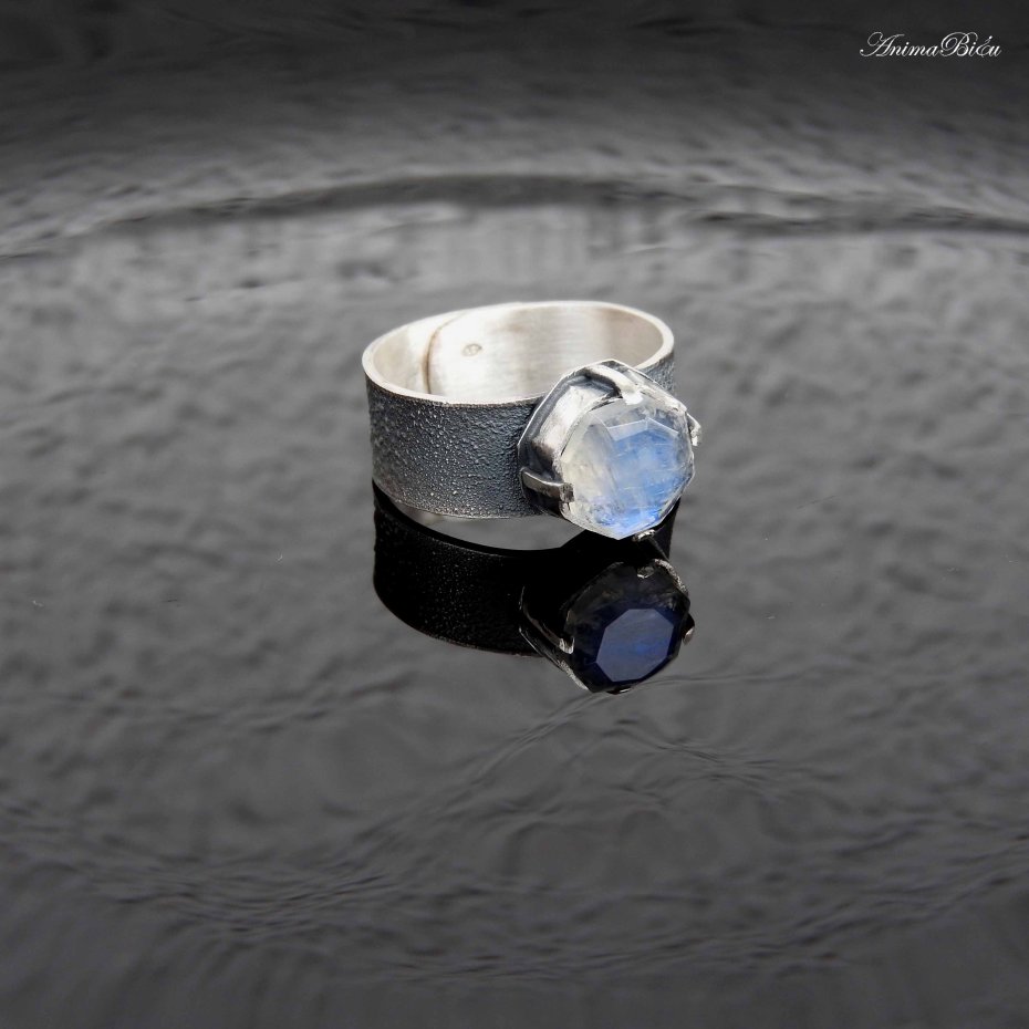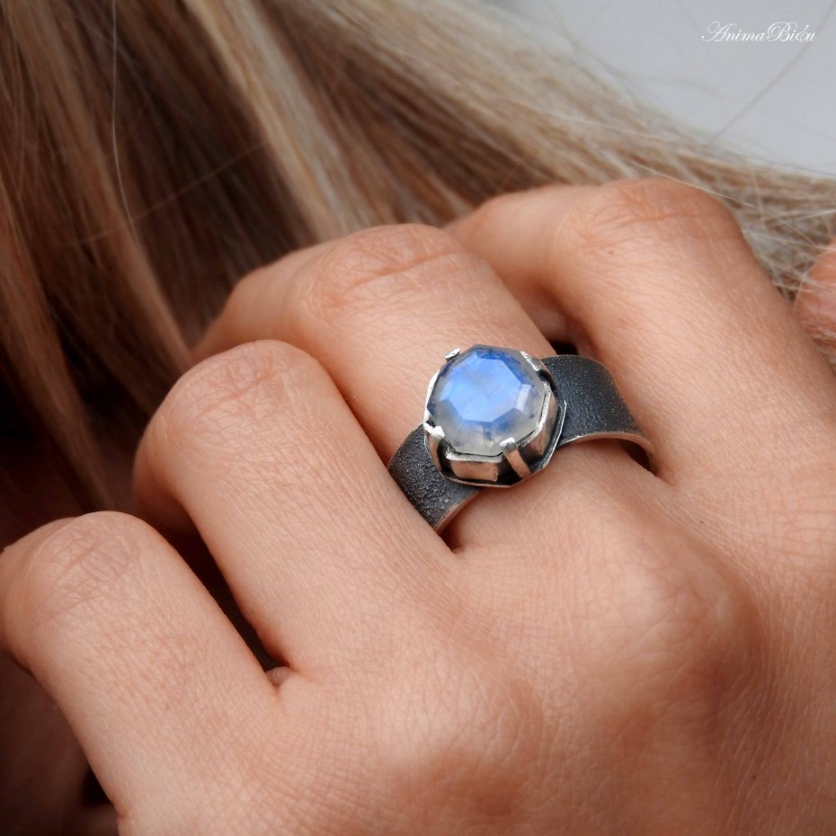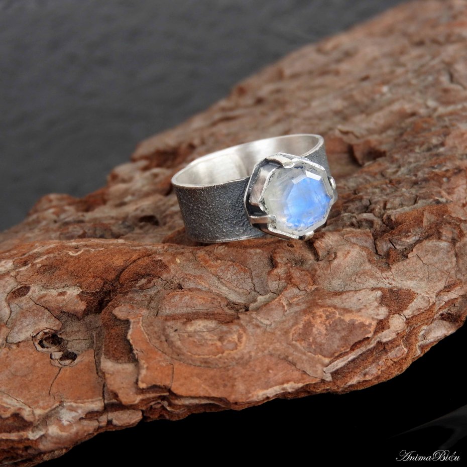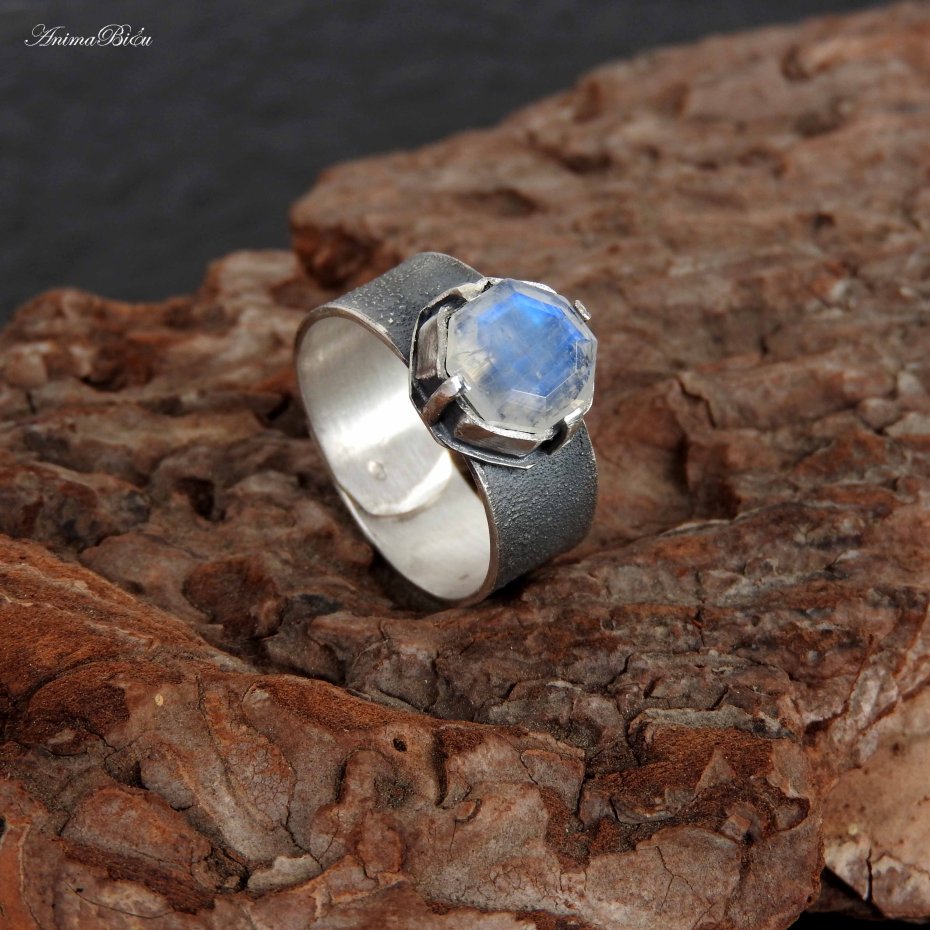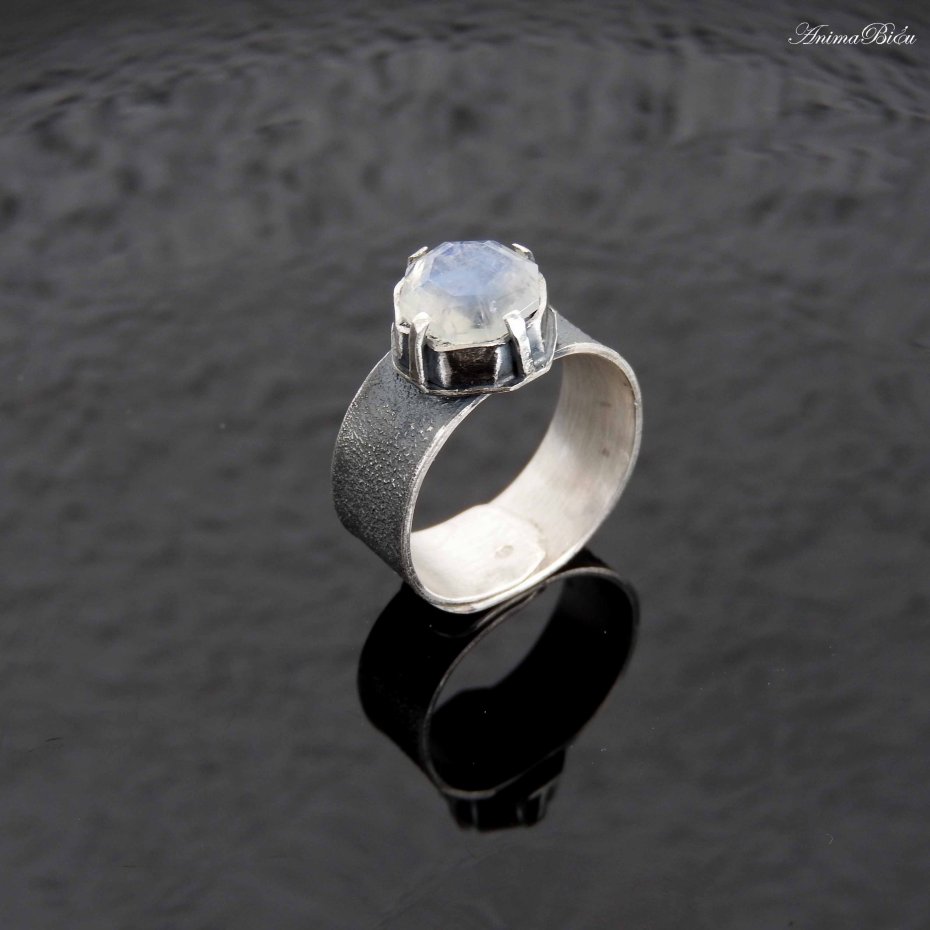 Obrączka srebrna z kamieniem księżycowym. Piękny, wysokiej jakości kamień księżycowy o ciekawym szlifie, który przypomina dawny szlif diamentowy, oprawiłam ręcznie w srebro próby 925 i 999. Tafla kamienia ma wyraźną, błękitną poświatę. Korona ma wymiary 12 na 12 mm, a wysokość 6 mm, osadziłam ją na fakturowanej obrączce o szerokości 8 mm. Srebro przyciemniłam i przetarłam na mat. Obrączka ma regulowany rozmiar, przy zakupie proszę o podanie rozmiaru jaki mam ustawić. Technika wykonania: lutowanie, młotkowanie. Waga obrączki: 6,4 gramy, w tym srebro 5,8 g.
