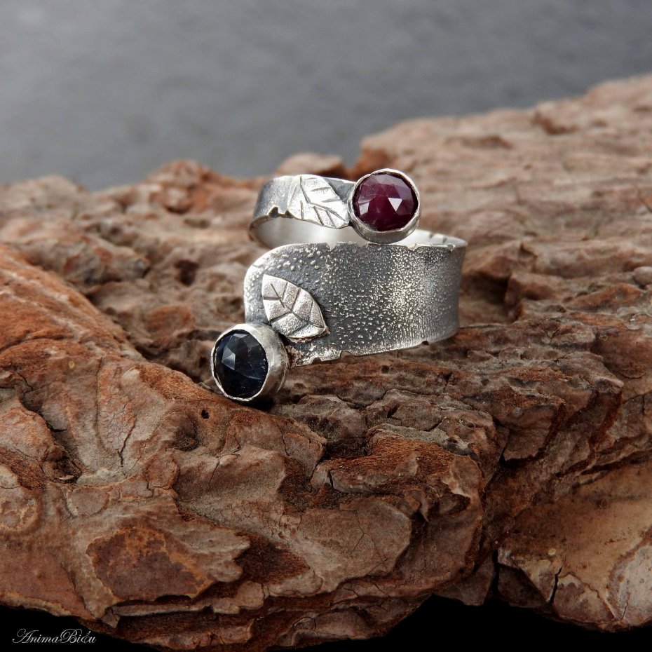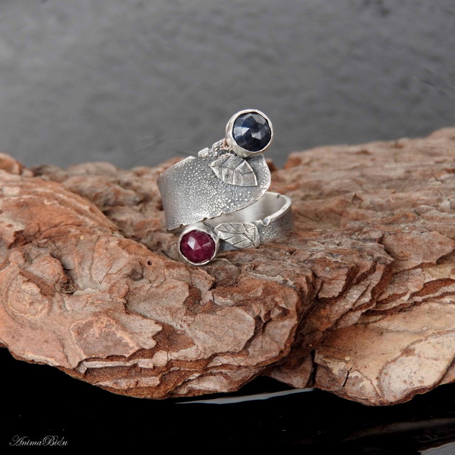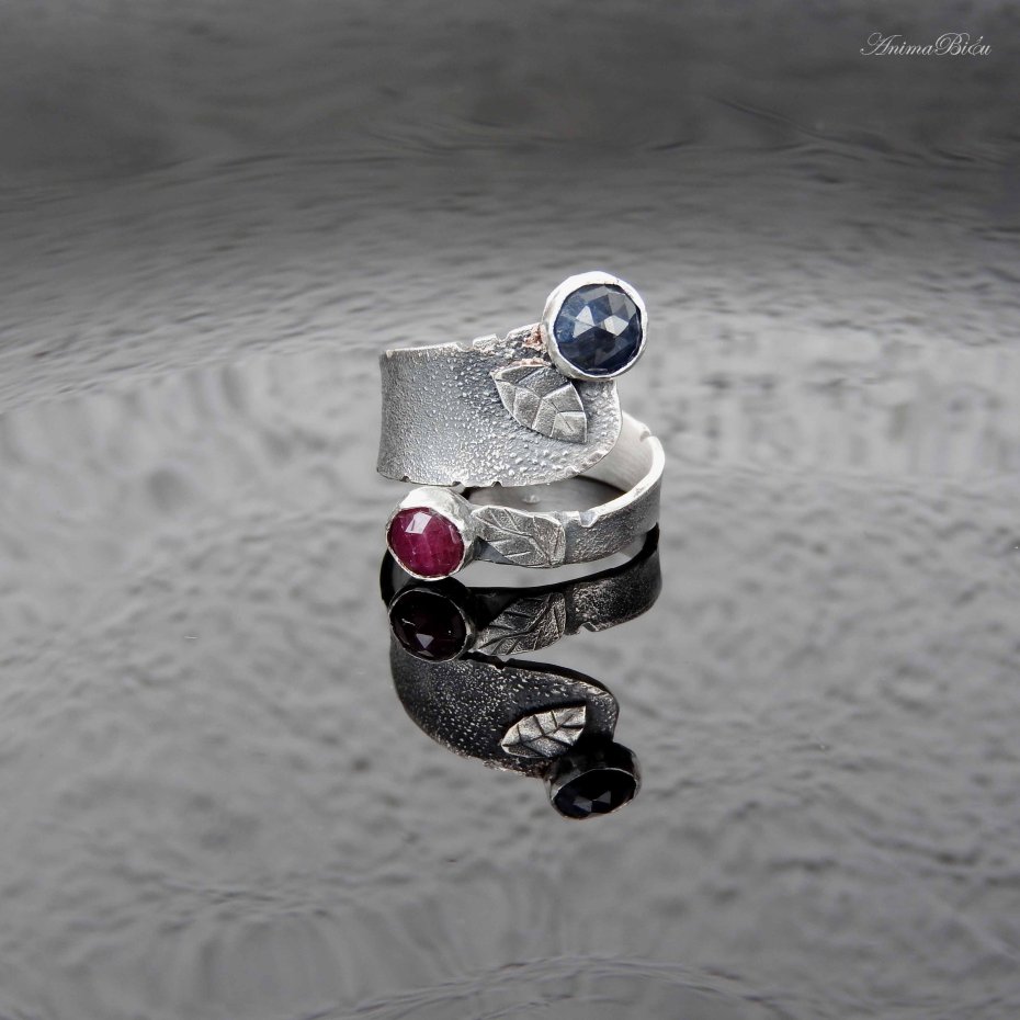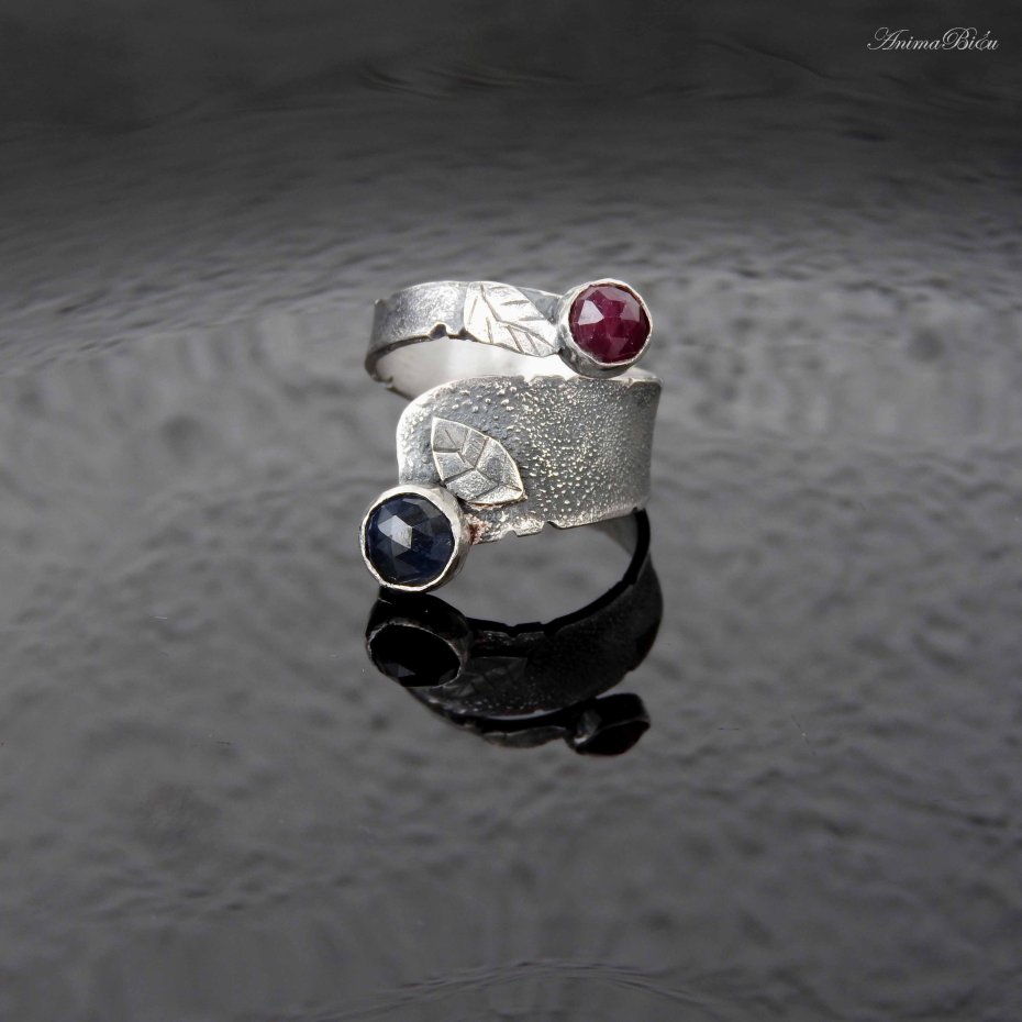 Obrączka srebrna z rubinem i szafirem. Obrączka powstała od podstaw ręcznie z fakturowanego srebra próby 925 i 999, które przyciemniłam i przetarłam. Oba kamienie mają fasetowaną powierzchnię, umieściłam je na przeciwległych biegunach obrączki, a przy każdej z koron mały, srebrny, rzeźbiony listek. Obrączka przy szafirze ma szerokość 12 mm, przy rubinie 4 mm. Rozmiar jest regulowany w zakresie od 16 do 23, przy zakupie proszę o podanie rozmiaru jaki mam ustawić. Waga: 6,2 g, w tym srebro 5,7g. Cechowana w Urzędzie probierczym.