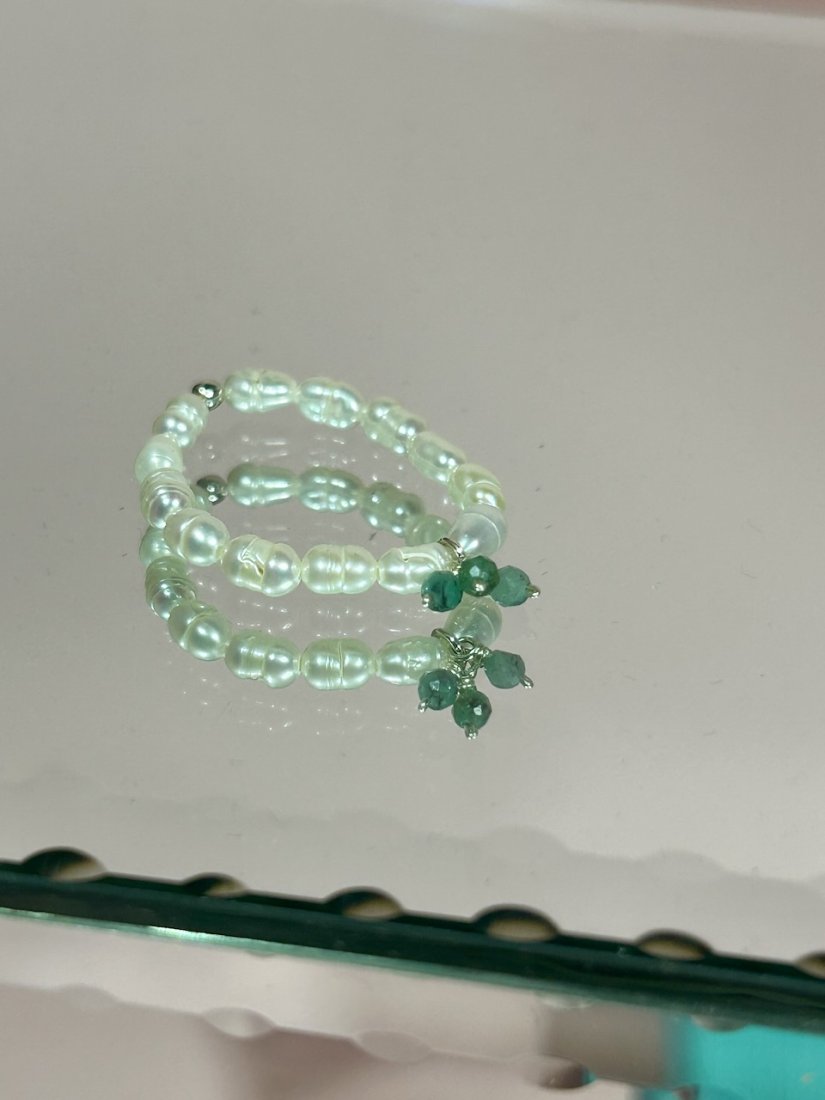 Malutkie słodkowodne perełki ozdobione malusieńkimi chwościkami z naturalnych szmaragdów fasetowanych oraz delikatna srebrną kuleczką.