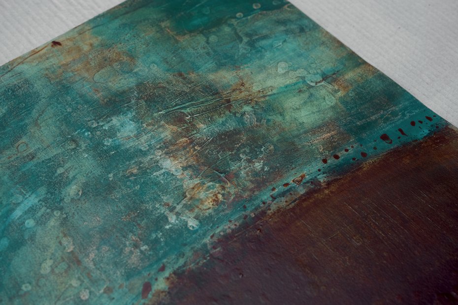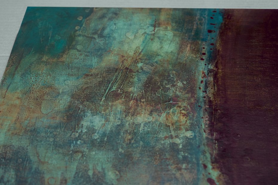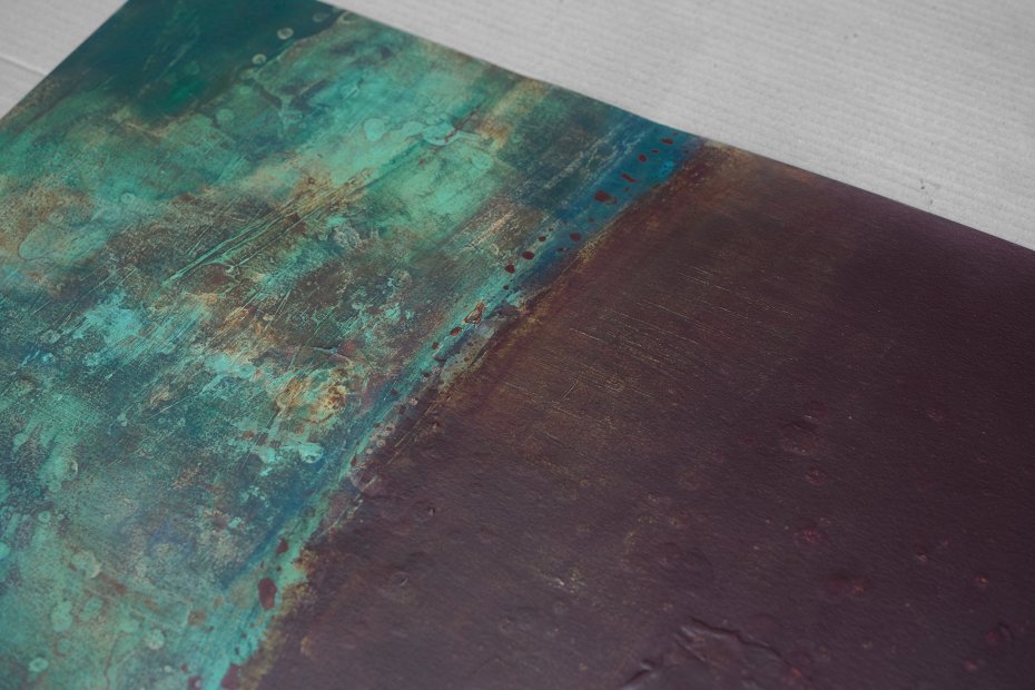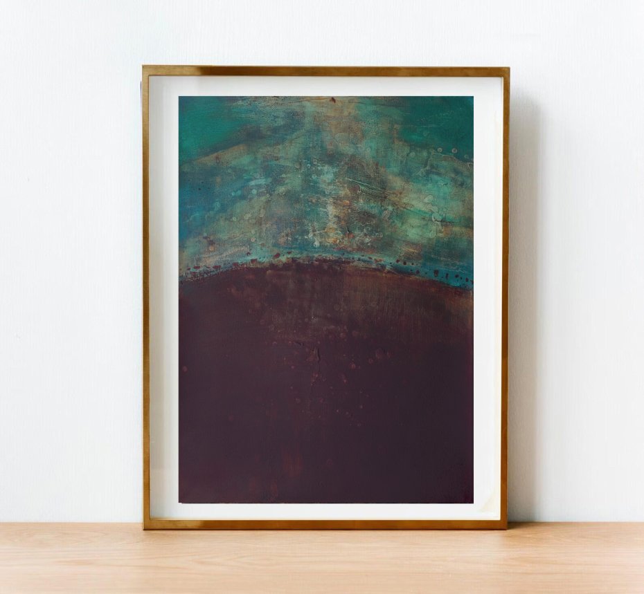 "Turquoise Horizon" to oryginalny obraz abstrakcyjny wykonany farbami akrylowymi na papierze. Kompozycja łączy chłodne odcienie teal i turkusu z głębokim brązem, tworząc nastrojowy, teksturalny pejzaż. Delikatne przejścia barw i bogata faktura przywodzą na myśl naturę – horyzont, wodę, niebo lub organiczne struktury – pozostawiając przestrzeń do własnej interpretacji.