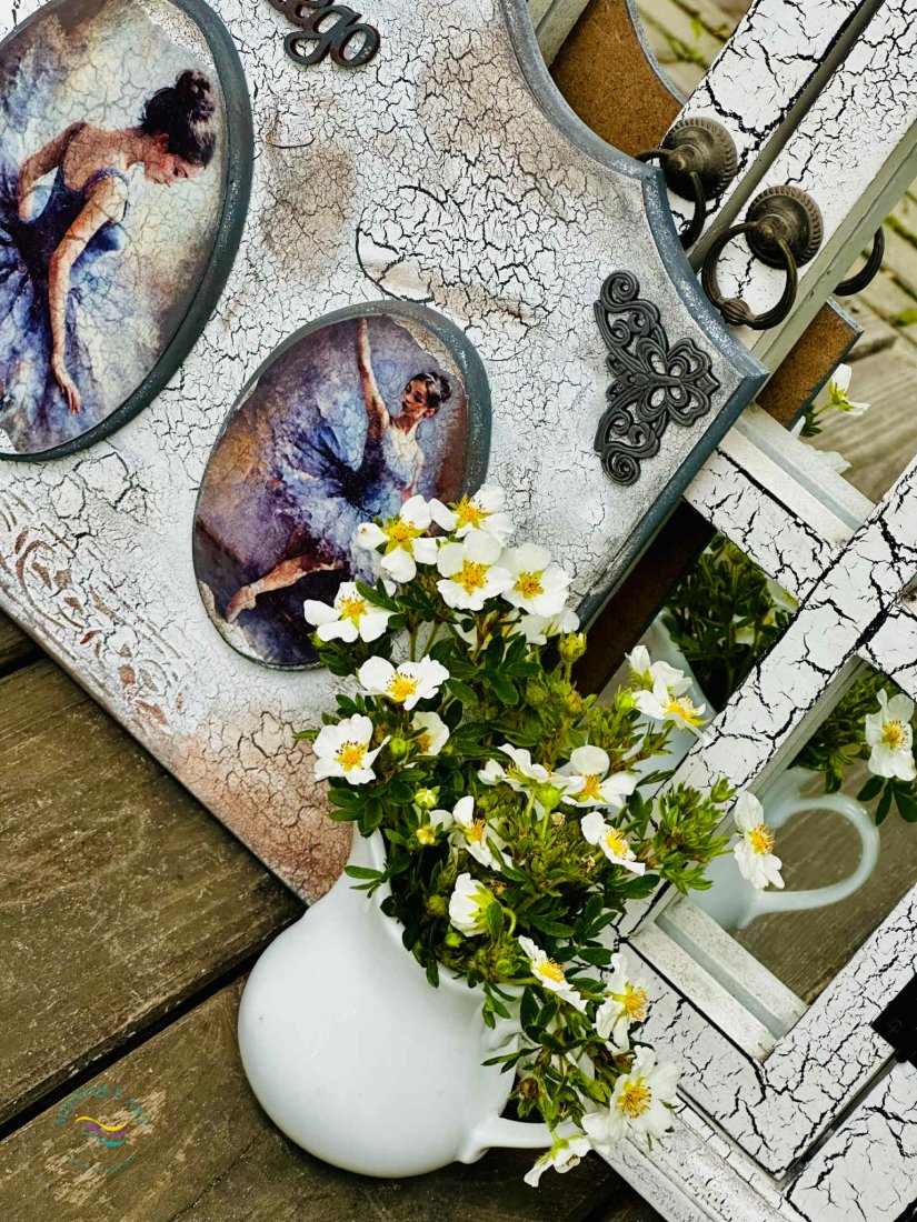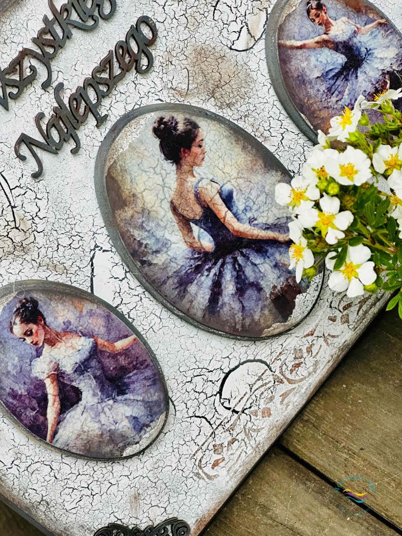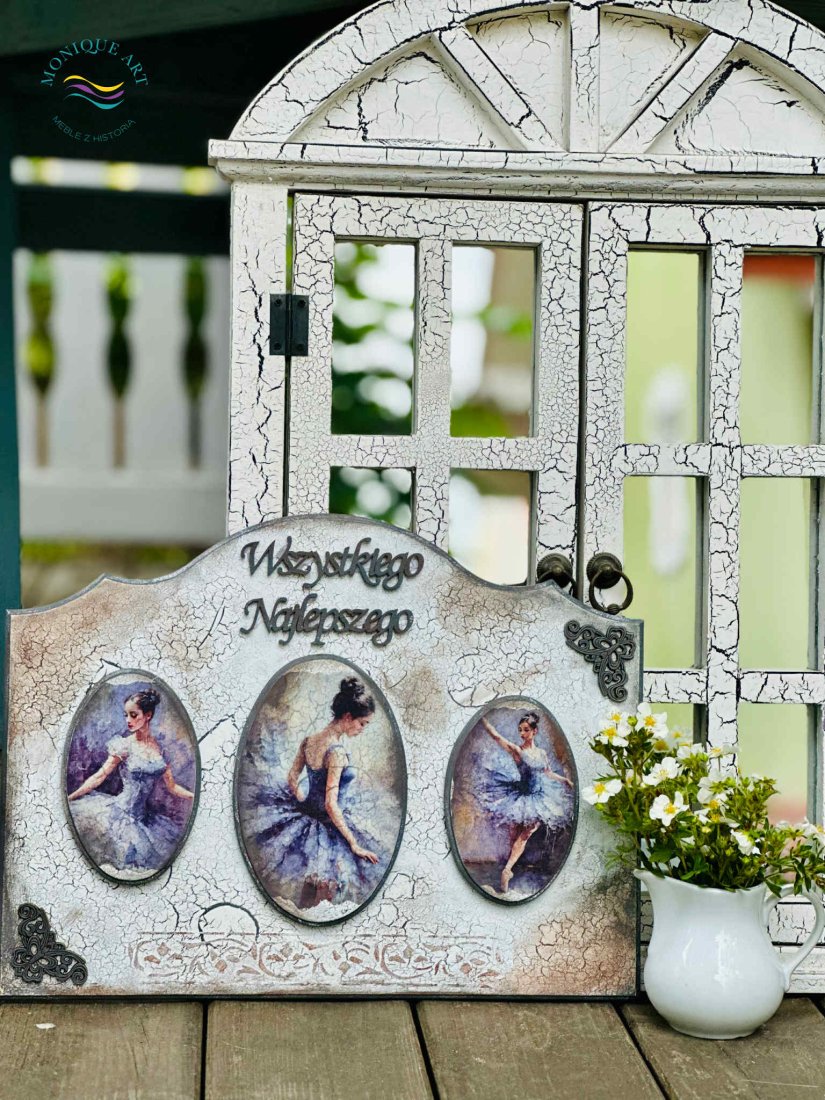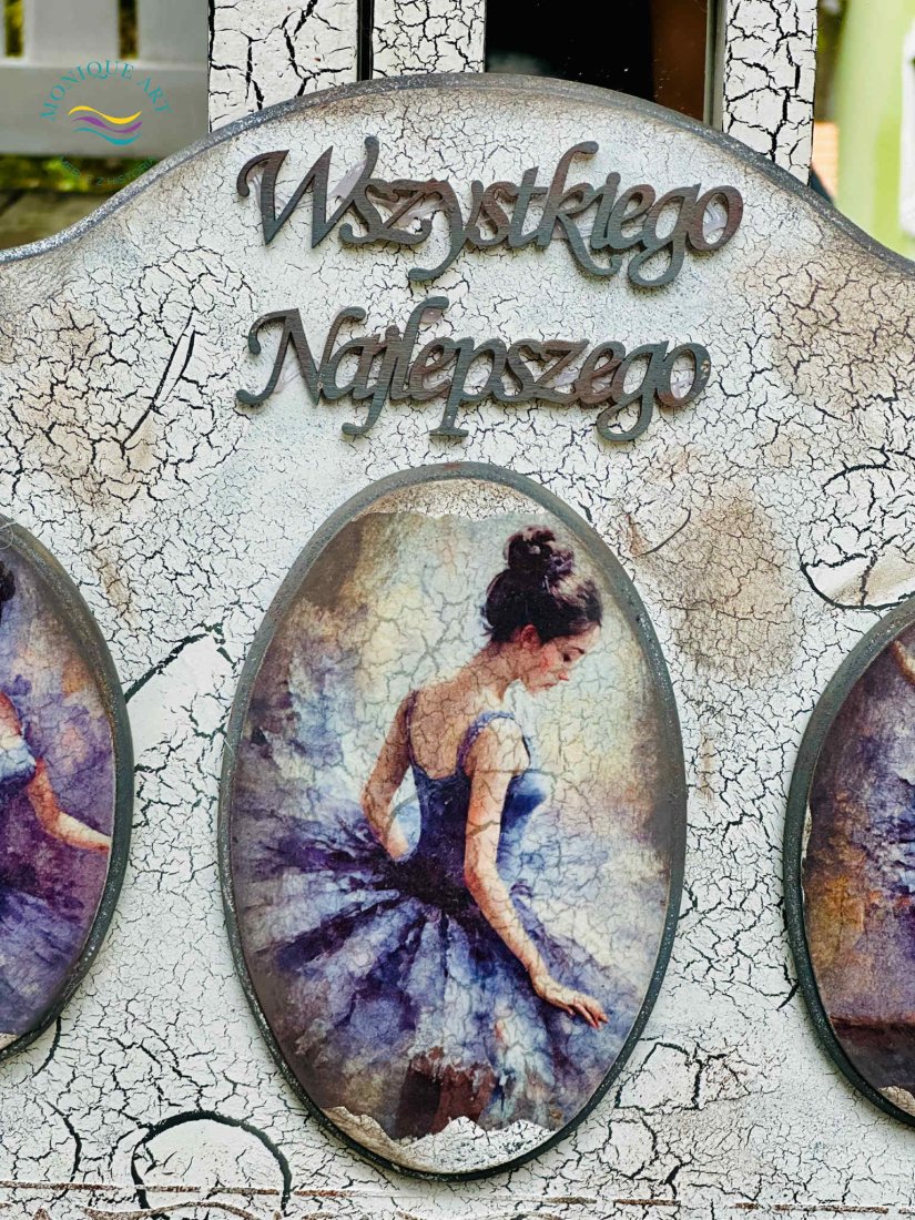 Trzy romantyczne wizerunki baletnic w pastelowych tonacjach zamknięte w owalnych medalionach, tło w technice spękań shabby chic i ozdobne narożniki (motyle) tworzą elegancką, sentymentalną całość.