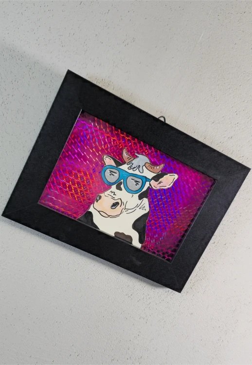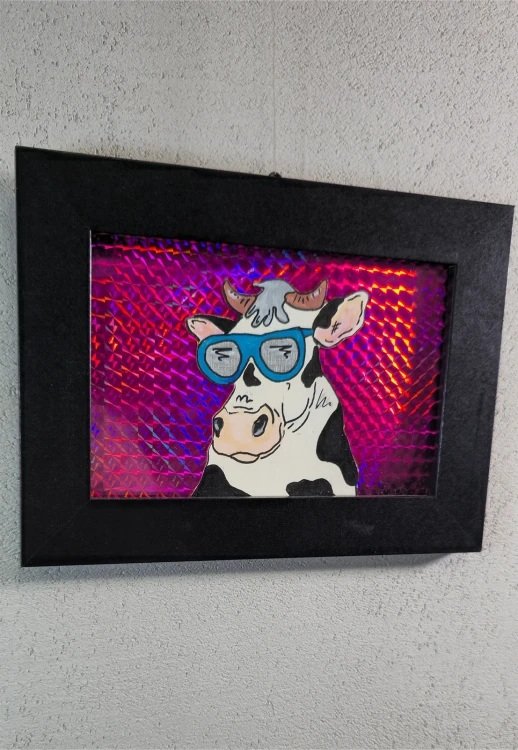 Mały format, wielka energia! Ta krowia sztuka, rozświetli każde wnętrze. Odbijające światło, holograficzne tło mieni się jak dyskotekowa kula.