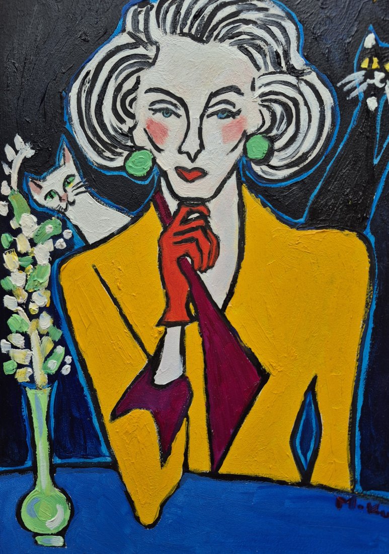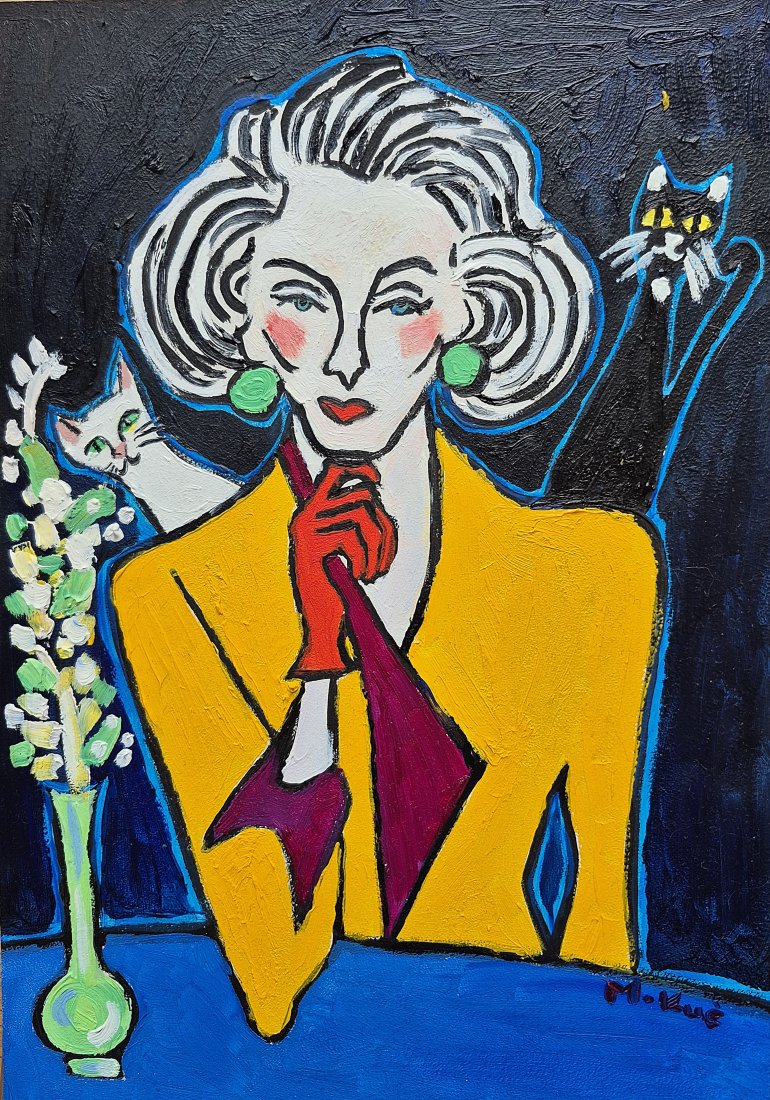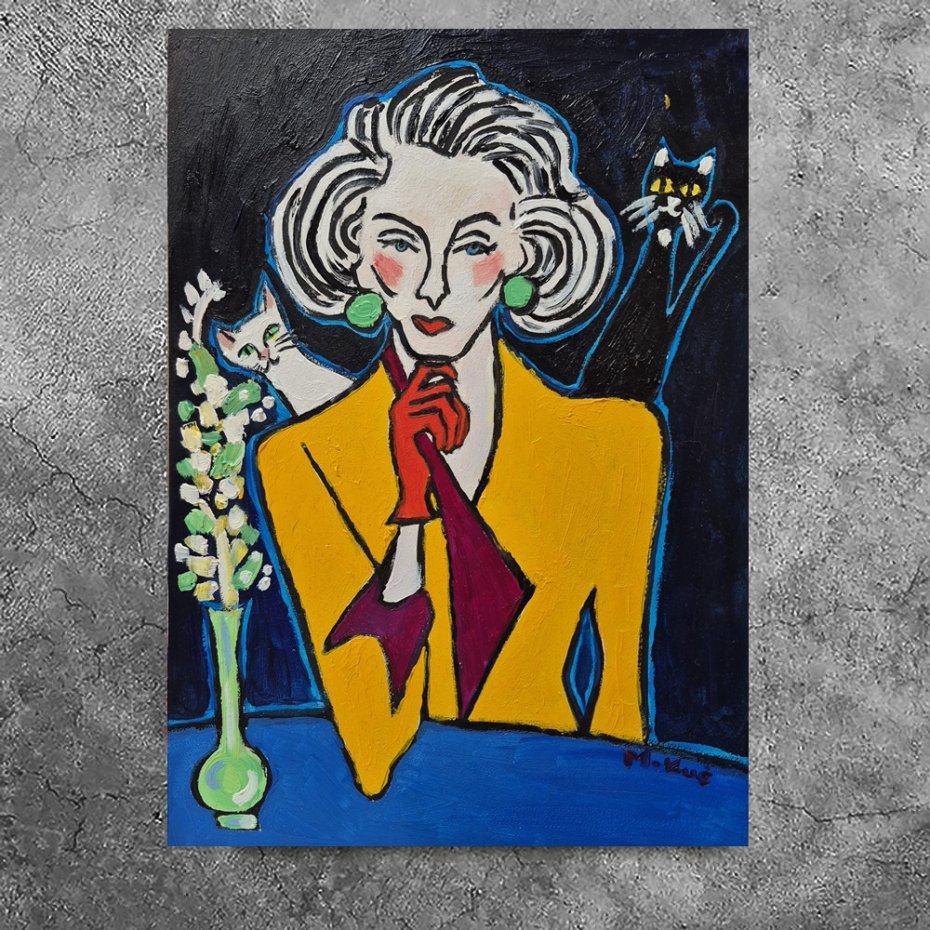 Na obrazie dominuje głęboka czerń tła, jakby noc była tu gęsta i lekko chropowata od farby. Pośrodku siedzi kobieta o twarzy zbudowanej z prostych linii, bieli i różowych rumieńców, z włosami w szerokich, falujących pasmach. Żółta marynarka świeci jak latarnia, a czerwone rękawiczki i usta robią mocny kontrast. Zielone kolczyki są okrągłe i trochę zuchwałe. Z lewej wąski wazon z białymi kwiatami, obok biały kot, z prawej czarny z żółtymi oczami. Jest trochę jak teatr. Artysta używa grubego konturu i płaskich plam koloru, w stylu lekko ekspresyjnym, z widoczną fakturą pociągnięć. Czuję spokój i napięcie naraz, taki mood do myślenia. Ona wygląda, jakby znała sekret i nie chciała go powiedzieć. Koty są śmieszne i trochę straszne. To pani i dwa kotki.