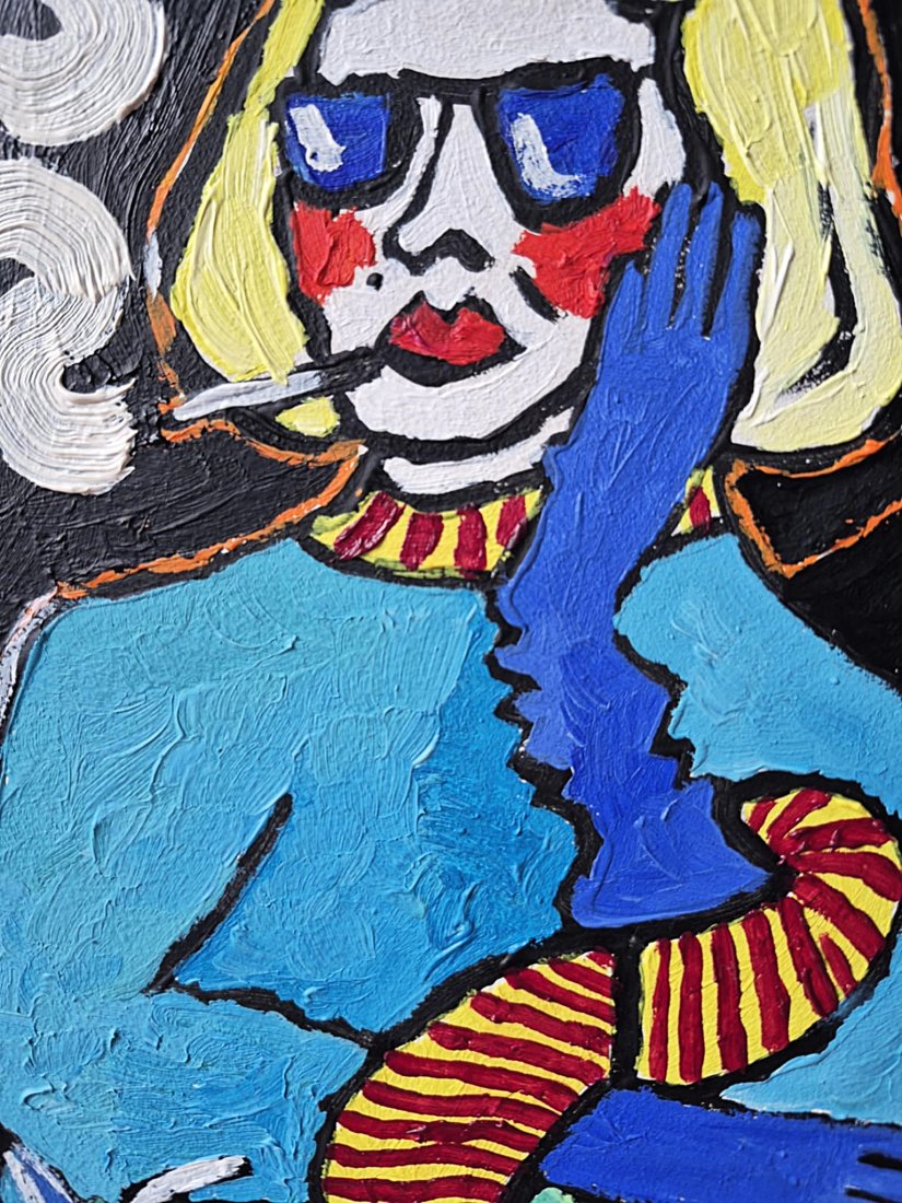 Na ciemnym, niemal nocnym tle wyłania się postać kobiety o jasnych, żółtawych włosach i twarzy zbudowanej z kontrastów: bladej bieli, intensywnej czerwieni policzków i ust oraz chłodnego błękitu okularów. Jej spojrzenie jest ukryte, odgrodzone szkłem – jakby była obecna, ale jednocześnie zdystansowana. Papieros w ustach i unoszący się obok miękki, falujący dym nadają scenie leniwy, lekko dekadencki rytm.