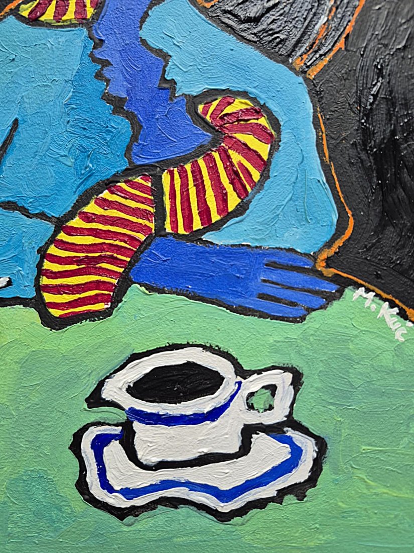 Na stole – zielonym jak scena teatralna – stoją dwa rekwizyty codzienności: filiżanka kawy oraz koktajl w kieliszku, z parasolką i słomką. To symbole przyjemności, chwili zawieszenia, miejskiego rytuału. Z prawej strony obrazu pojawia się czarny kot – smukły, czujny, trochę ironiczny obserwator. Jego obecność dodaje nuty tajemnicy i lekkiej niepokoju.