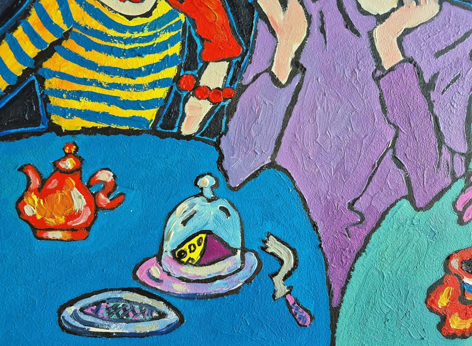 Stół przed nimi to osobna opowieść: mały czerwony czajniczek jak z bajki, talerzyk z serem pod kloszem, filiżanka kawy na ognistym spodku, niebieska butelka — rekwizyty codzienności podniesione do rangi symboli. Wszystko obwiedzione grubą, ciemną linią, jak w teatrze lalek, gdzie świat jest uproszczony, lecz przez to bardziej wyrazisty.