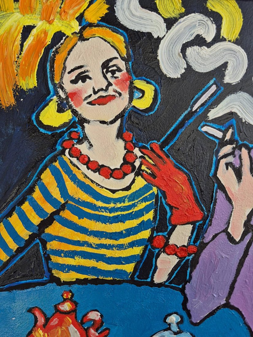 W centrum — postać zamyślona, z twarzą opartą na dłoni. Fiolet jej stroju łagodnie kontrastuje z rumieńcem policzków. Dym papierosa oplata ją jak myśl, która nie chce się rozproszyć. To cisza wśród kolorów, chwila zawieszenia, melancholia o łagodnym spojrzeniu.