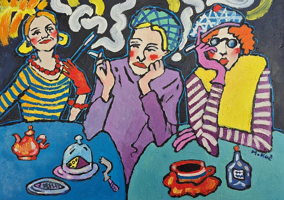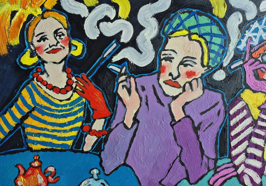 Obraz pulsuje kolorem jak wieczór w zadymionej kawiarni, gdzie czas płynie wolniej, a rozmowy unoszą się w powietrzu niczym białe, wijące się wstęgi dymu. Trzy postaci siedzą przy stole, każda zanurzona w swojej pozie, a jednak splecione wspólną chwilą.