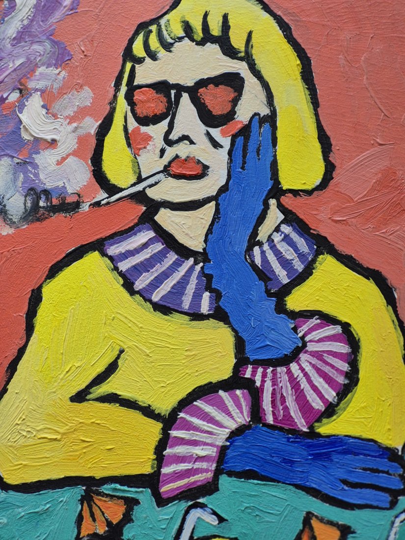 Obraz prezentuje postać kobiety, która siedzi przy stole o turkusowej powierzchni. Jej wyraziste, żółte włosy kontrastują z czerwonym tłem. Czy to wygląda na relax czy może na głębokie zamyślenie ? Ona ma na sobie jaskrawą, żółtą bluzkę i fioletowy szal, a jej ręka wspiera głowę. Okulary słoneczne i papieros w ustach dodają jej nonszalancji. Dym unosi się spiralnie, tworząc wokół niej artystyczny chaos. Na stole stoją dwa drinki w szklanych kieliszkach, udekorowane plasterkami cytryny i parasolkami.