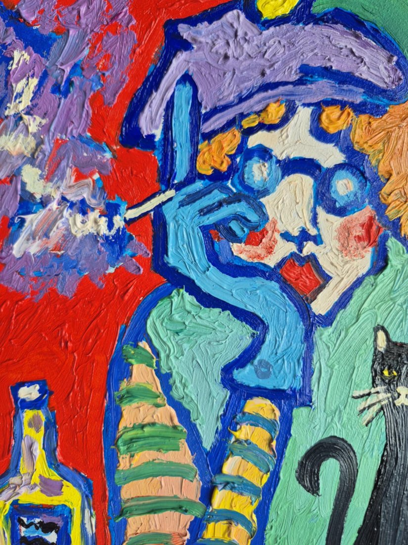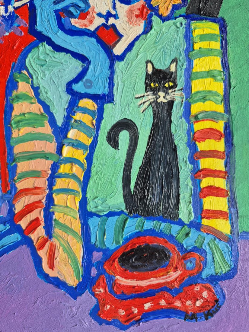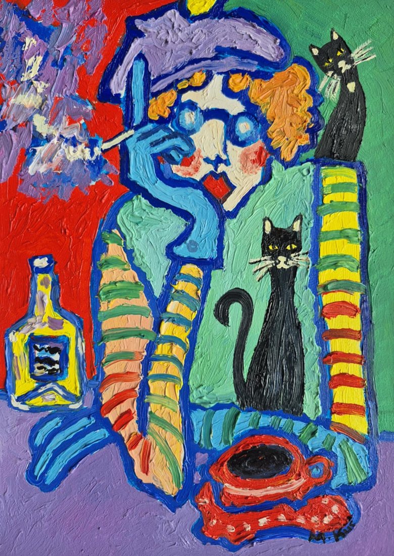 Na obrazie widać żywe kolory, które od razu przyciągają wzrok. Dominują intensywne czerwienie, niebieskości i zielenie. Postać nosi fioletowy beret, a jej spojrzenie jest przesiąknięte pewnym zamyśleniem. Obok niej siedzą dwa czarne koty, które dodają całości lekkiej tajemniczości. Faktura obrazu jest grubo nakładana, co daje wrażenie dynamiki. Tło wypełnia czerwony i zielony kolor. Kompozycja jest nieco chaotyczna, ale w tym tkwi jej urok.