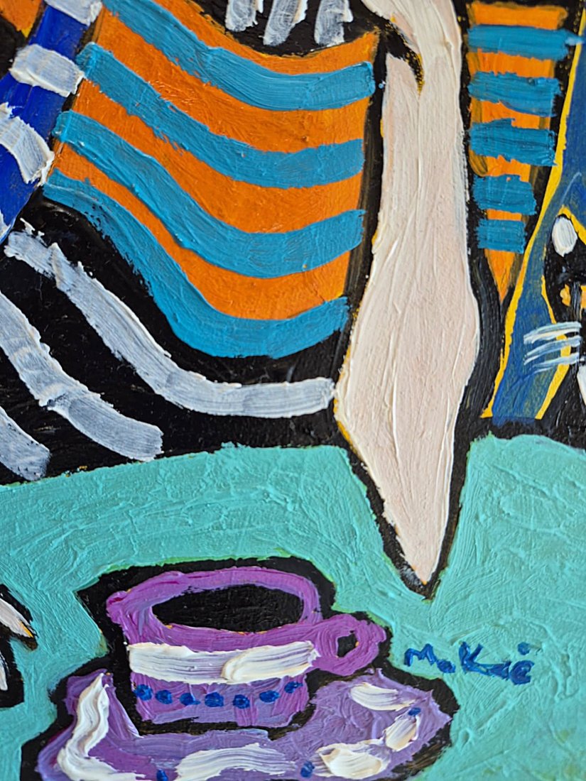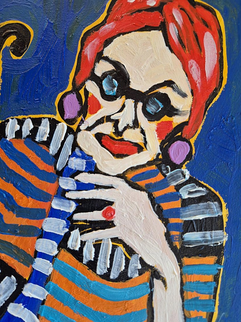 Na pierwszym planie siedzi kobieta — ułożona swobodnie, niemal teatralnie, jakby była częścią własnej dekoracji. Jej ciało oplata suknia zbudowana z pasów: falujących, niespokojnych, rytmicznych. Pomarańcz, błękit, biel i czerń pulsują jak emocje — raz ciepłe, raz chłodne — tworząc wizualną melodię, która prowadzi wzrok po całej powierzchni płótna. Materia nie jest miękka, lecz malarska: gruba farba, widoczny ślad pędzla, świadoma sztuczność.
