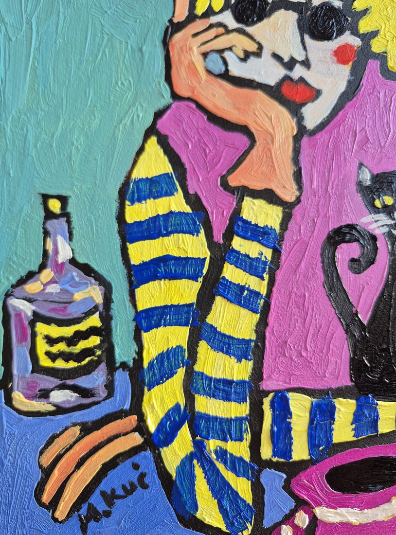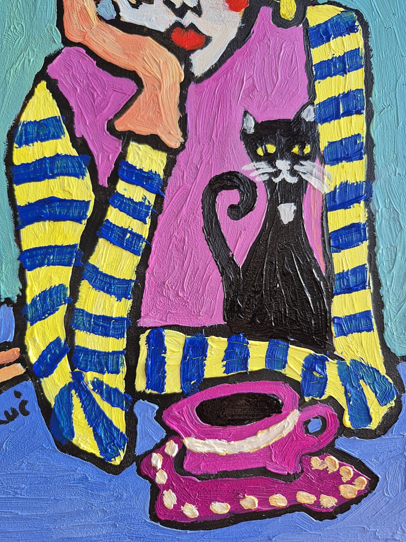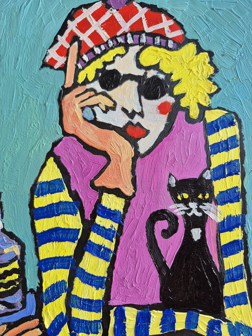Za nią znajduje się czarny kot, który wprowadza do kompozycji element ciepła i przytulności, jakby był wiernym towarzyszem. Po lewej stronie obrazu dostrzegamy butelkę na stole, która wprowadza dodatkowy kontekst do sceny, a przed postacią leży filiżanka i spodek w różowo-białe wzory, umieszczone na niebieskim stole. Tło dodaje głębi i kontrastu, sprawiając, że całość wydaje się harmonijna i pełna życia.