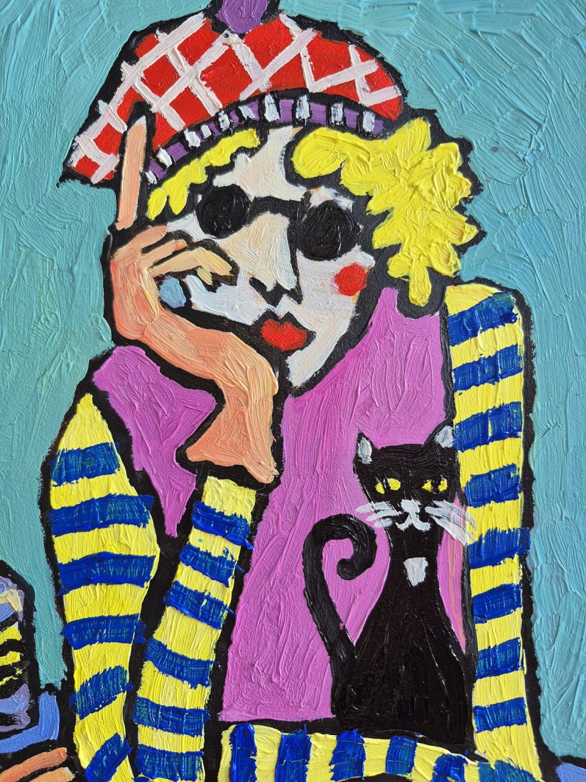 Obraz emanuje radosną energią dzięki intensywnym kolorom i grubym pociągnięciom pędzla. Centralną postacią jest kobieta o żółtych włosach, która przyciąga uwagę swoim czerwono-białym w kratkę kapeluszem oraz czarnymi okularami przeciwsłonecznymi, które dodają jej tajemniczości. Ubrana w różową koszulę oraz żółto-niebieską, paskowany sweter, wydaje się być pełna życia i gotowa na przygodę.