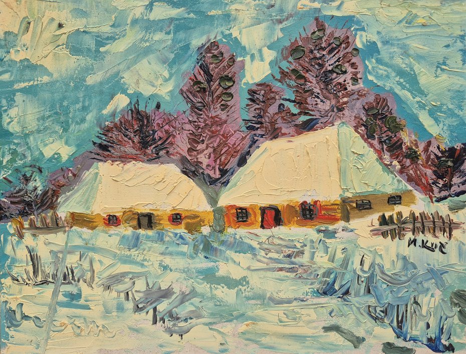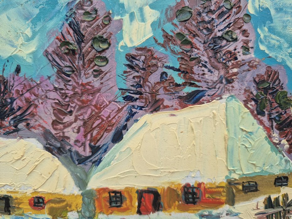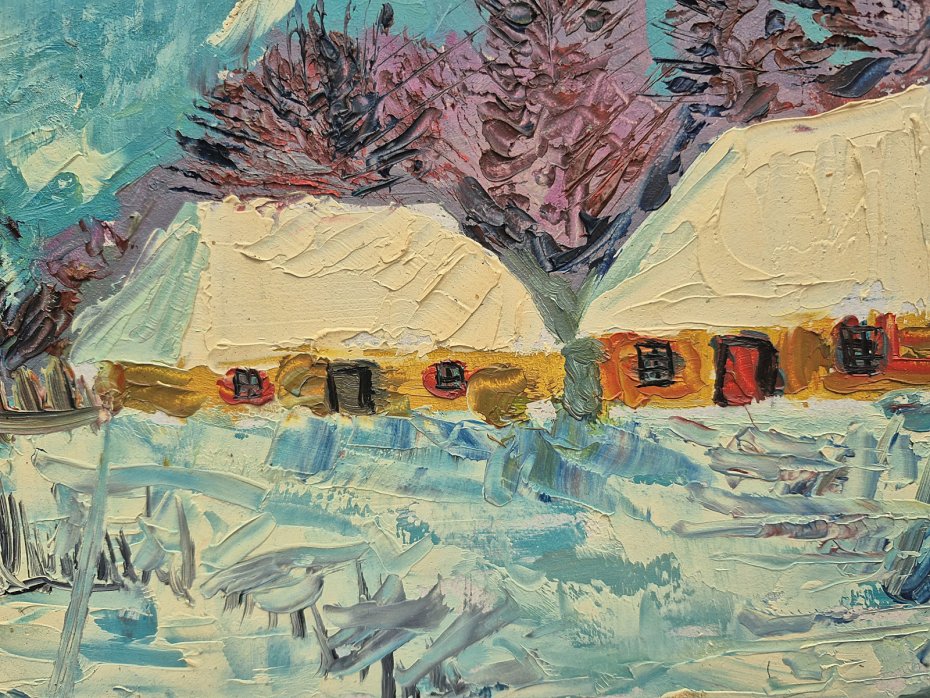 Obraz emanuje spokojem i ciepłem ukrytym pod warstwą chłodu. Grube, wyraźne pociągnięcia farby tworzą niemal rzeźbiarską fakturę — śnieg nie jest tu gładki ani cichy, lecz żywy, ciężki, niemal namacalny. Błękity i biele mieszają się z szarością, jakby mróz był w ciągłym ruchu, a powietrze drżało od zimna.