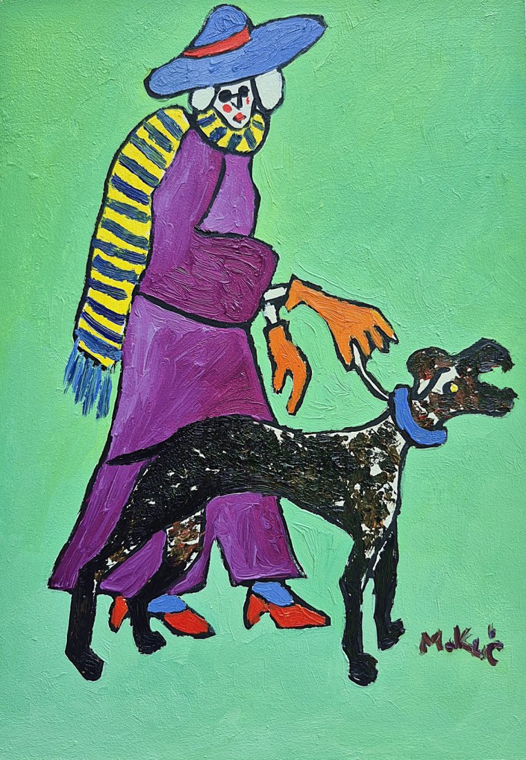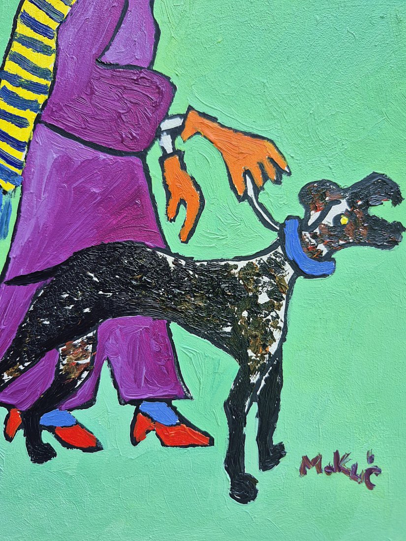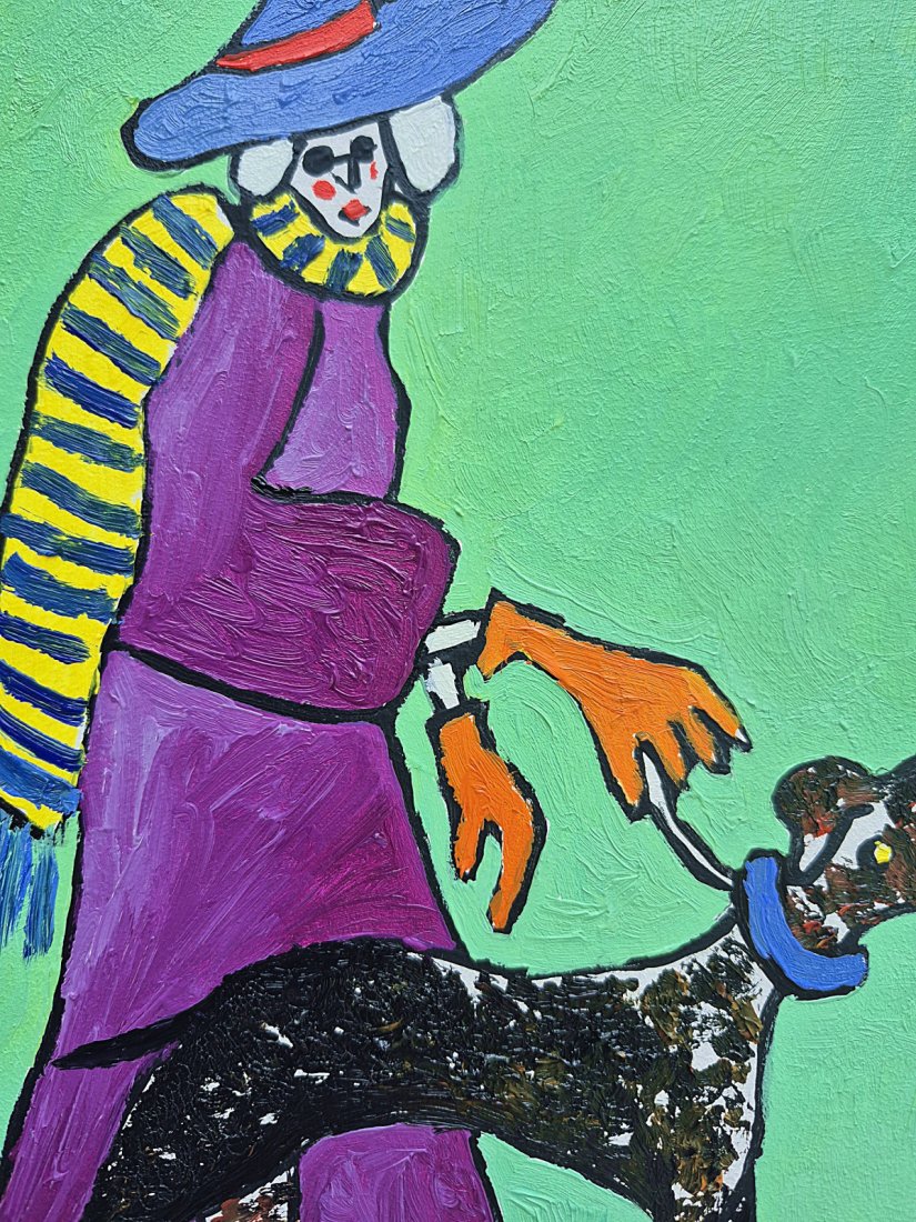 Obraz przedstawia postać w fantazyjnym stroju, skąpaną w jaskrawych kolorach. Wyraziste i kontrastowe barwy – od purpurowej sukienki po żółto-niebieski szalik – przyciągają wzrok i budzą poczucie radości i energii. Tło jest zielone, co dodatkowo podkreśla wyrazistość postaci i psa, który towarzyszy jej na smyczy. Kształty są proste i zarysowane grubymi konturami, nadając całości nieco dziecięcego uroku. Wiesz co? Piesek na obrazku wygląda, jakby chciał się bawić!