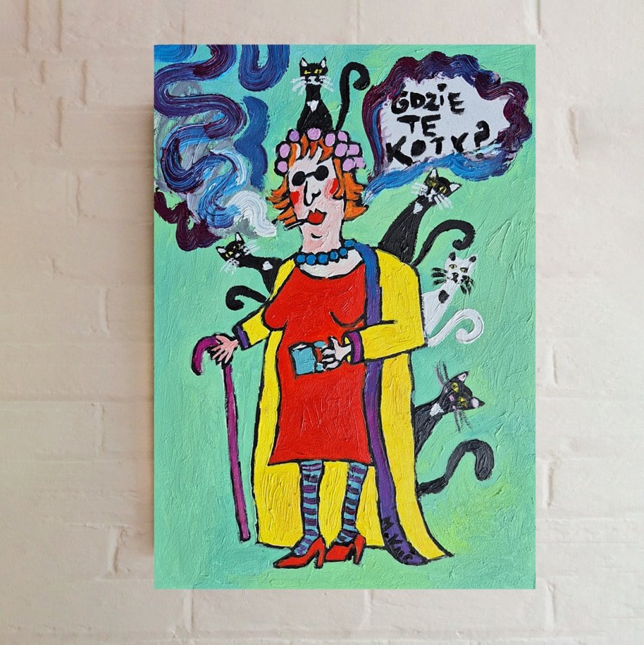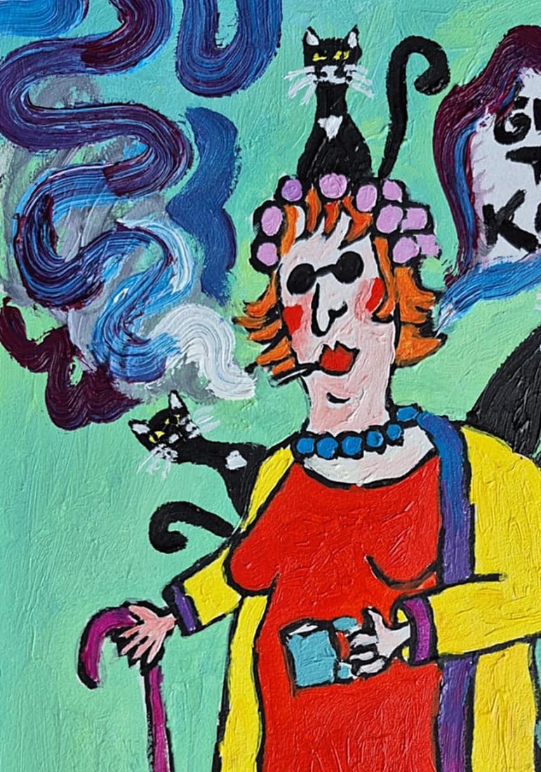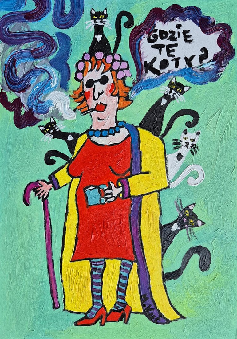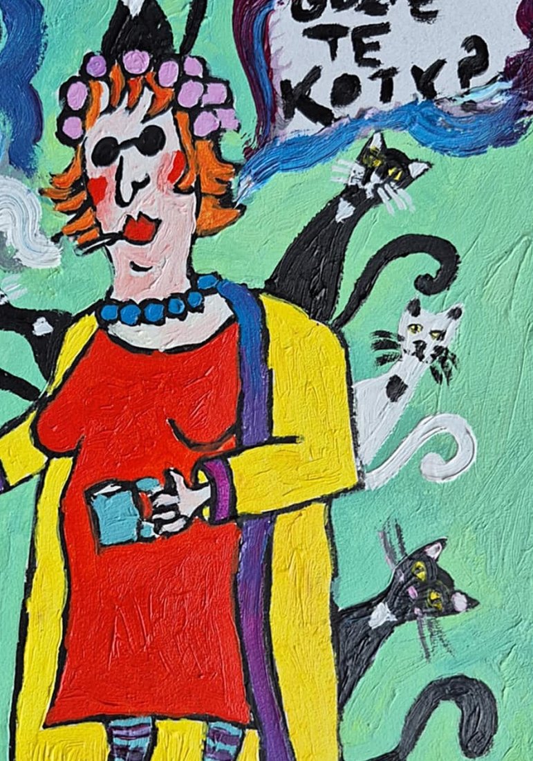 Kobieta pali papierosa, a unoszące się z niego dymy mają barwy fioletu i błękitu, jakby były malowane ruchem pędzla zanurzonego w fantazji. Z chmury dymu wyłania się napis: "Gdzie te koty?" – ironiczny, bo przecież kotów jest tu całe stado. Napis wzmocniony ekspresyjnym, surowym liternictwem dodaje całości komiksowego charakteru.