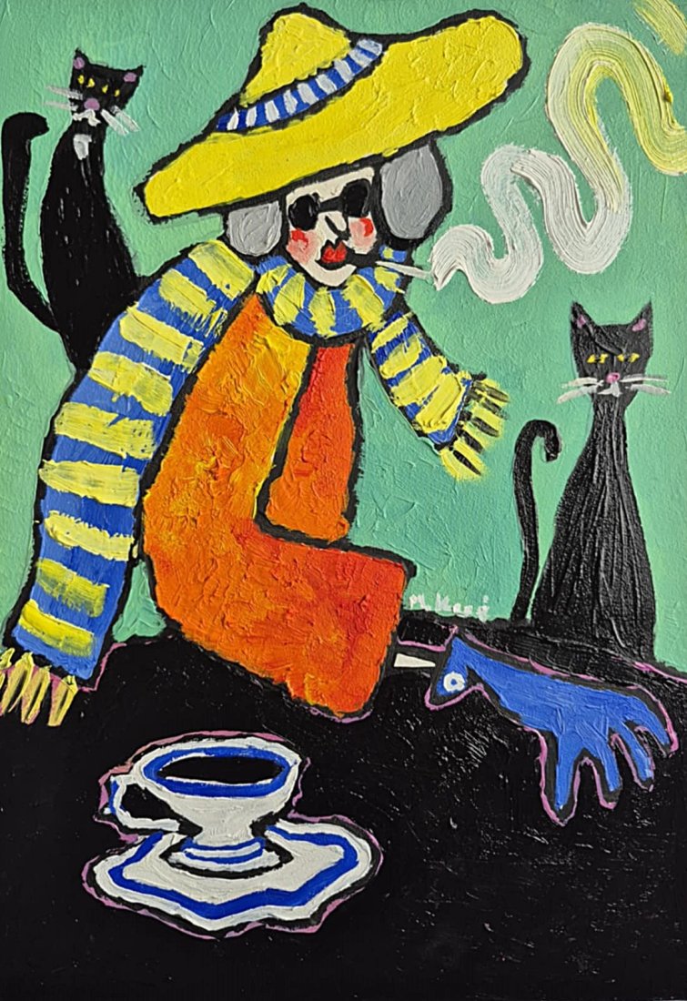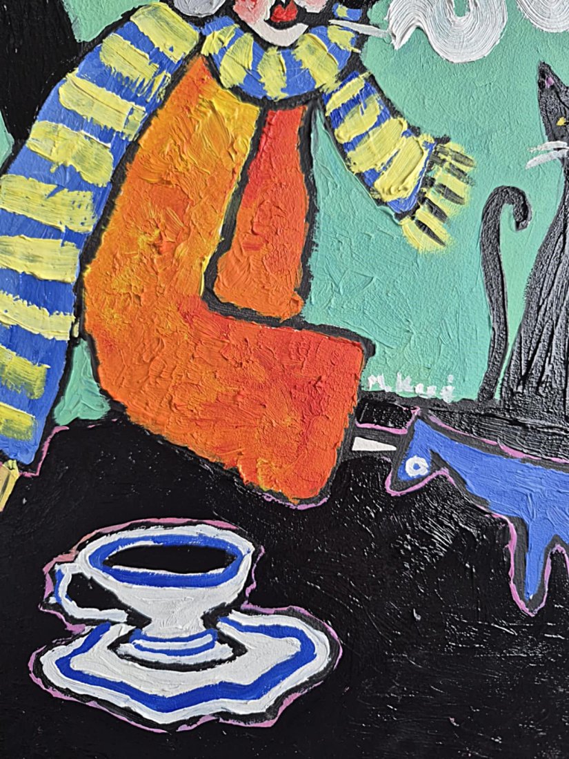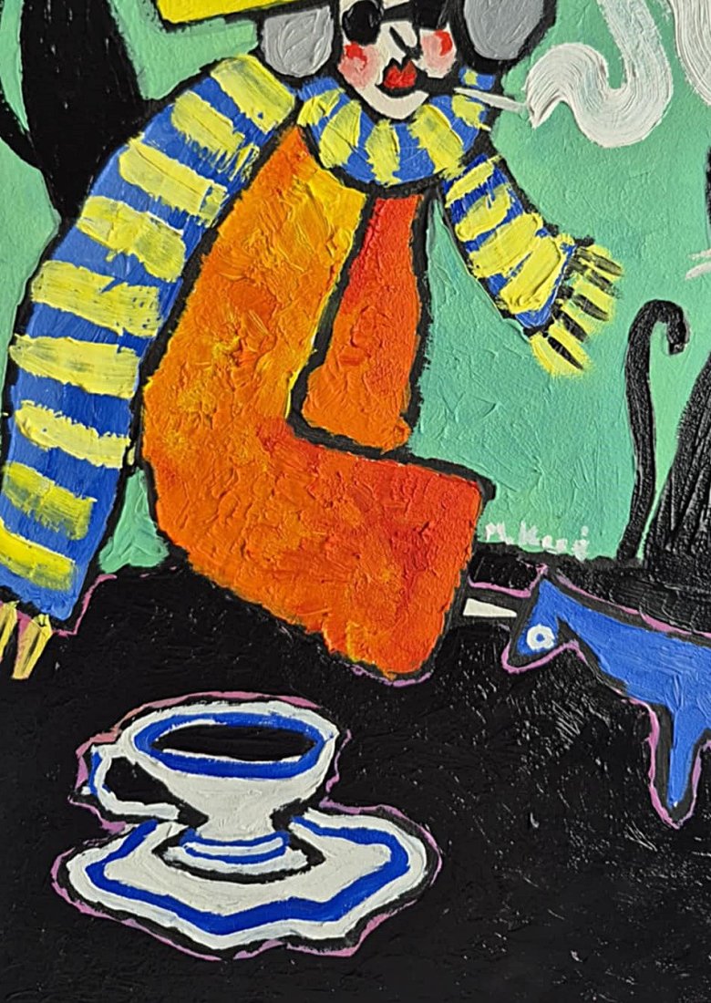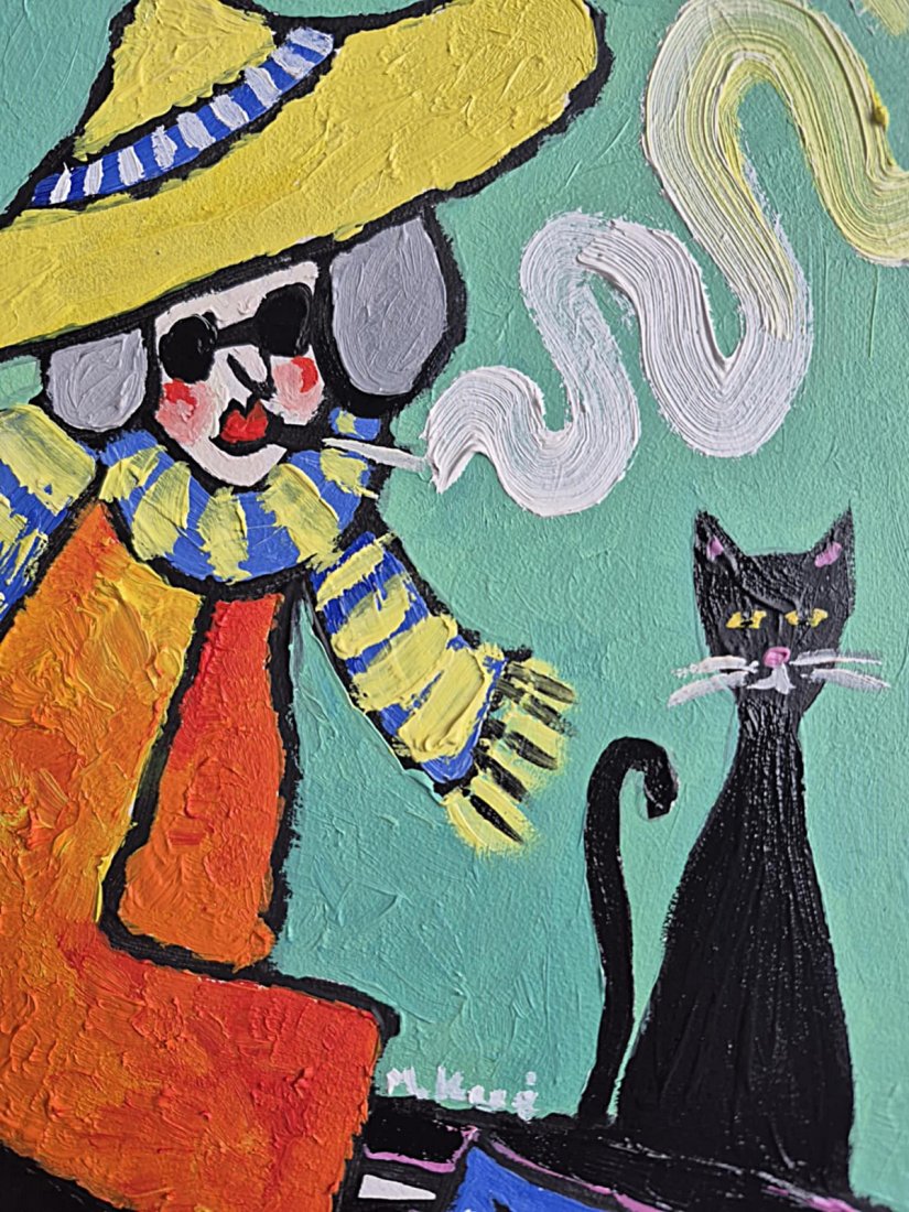 To obraz jak sen opowiedziany grubą, pewną kreską i farbą kładzioną bez wahania. W centrum siedzi postać o twarzy maski – trochę klaun, trochę wędrowiec – w ogromnym żółtym kapeluszu, który zdaje się być zbyt ciężki dla rzeczywistości. Ubrana w pasiasty, niebiesko-żółty szalik i ognisto pomarańczowy płaszcz, wygląda jak ktoś, kto przyszedł z innego świata, gdzie kolory mają własny głos.