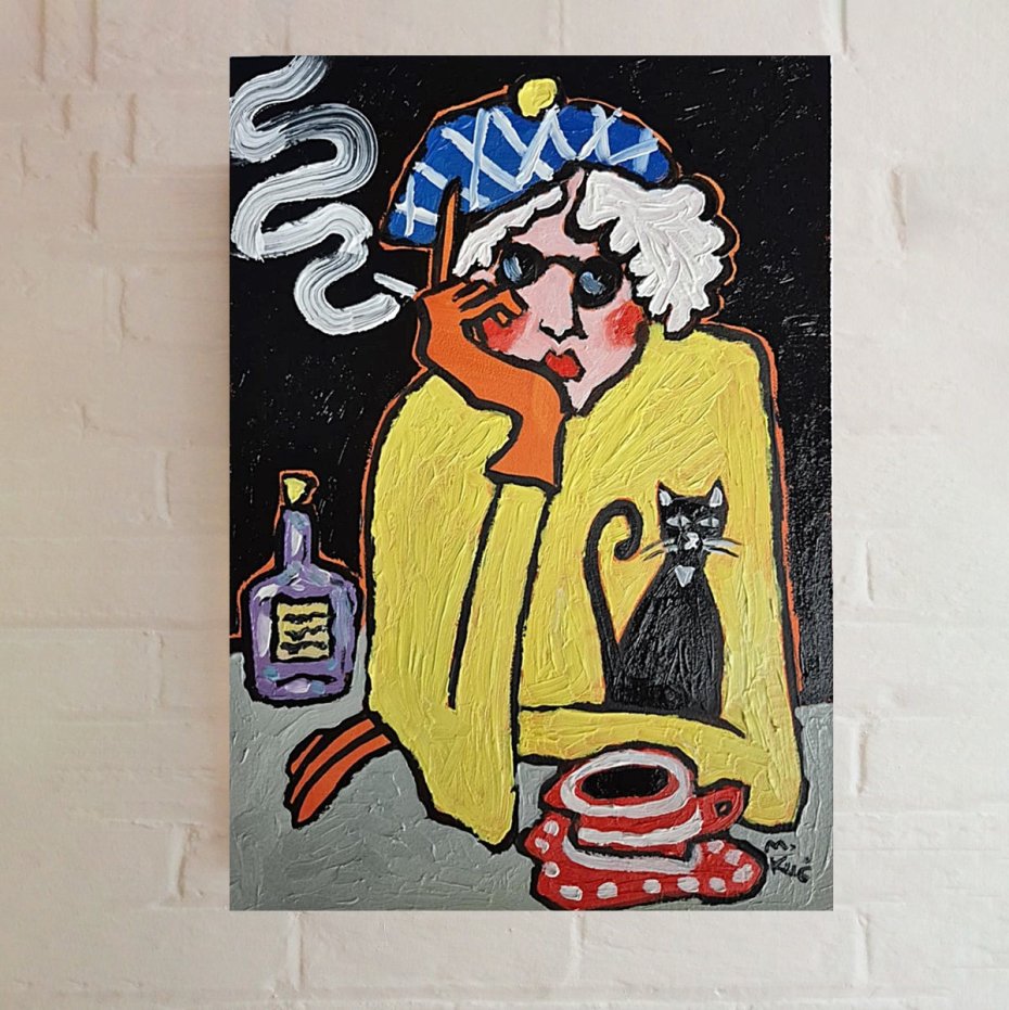 Obok postaci pojawia się czarny kot, spokojny i czujny, który może symbolizować samotność, niezależność albo cichego towarzysza codzienności. Na stole stoi filiżanka kawy oraz butelka, z których unosi się sugestia rutyny, nocnego czuwania lub refleksji. Wijący się dym po lewej stronie obrazu podkreśla atmosferę zadumy i wewnętrznego niepokoju.