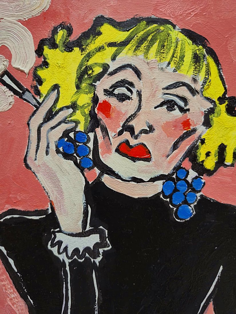 Całość jest surowa, ekspresyjna, z wyraźnym śladem ręki artysty. Obraz nie próbuje być piękny w klasycznym sensie — raczej szczery. To portret chwili: samotnej, eleganckiej, trochę znudzonej, trochę zamyślonej. Jakby świat na moment zamilkł, a ona została sama z dymem, kawą i własnymi myślami.