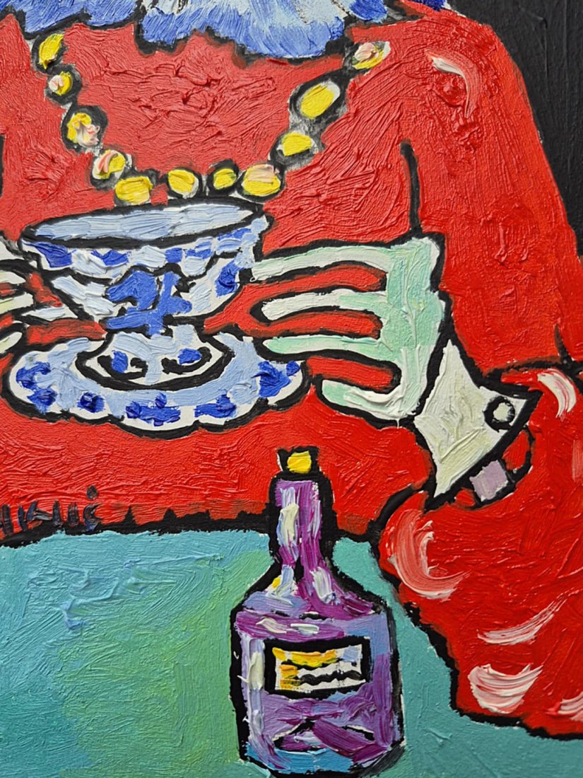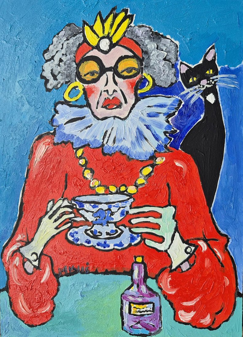 Na obrazie widzimy postać starszej damy – być może ekscentrycznej arystokratki lub emerytowanej divy teatru – zasiadającej do popołudniowej herbaty. Jej przesadny strój, teatralny makijaż i korona sugerują, że świat codzienności miesza się tu z fantazją. Wyraz twarzy – chłodny, nieco zniecierpliwiony – kontrastuje z jaskrawymi kolorami i dekoracyjnością postaci. W tle czai się czarny kot, który może być symbolem tajemnicy, niezależności lub… cichego współuczestnika jej rytuałów.