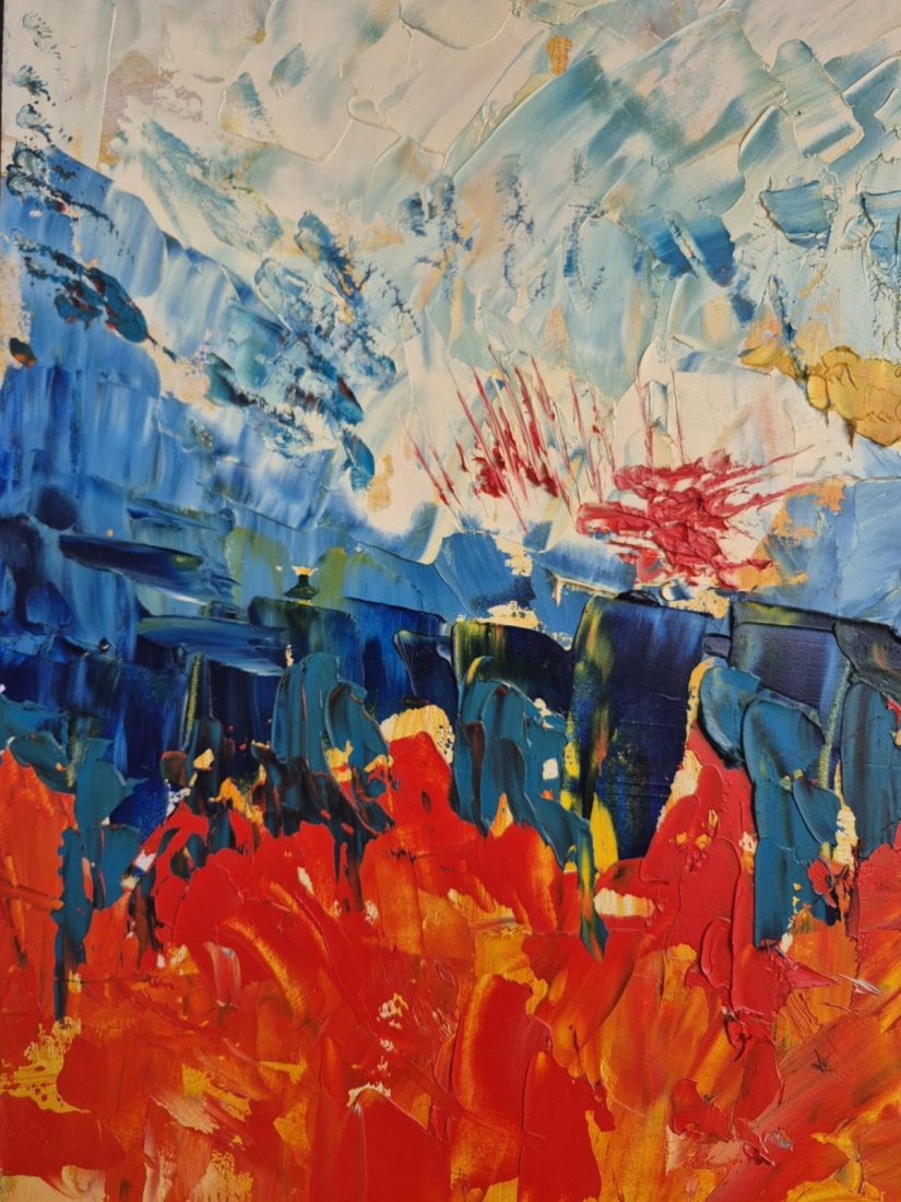 Niżej wszystko się zmienia. Błękity zagęszczają się, ciemnieją, zaczynają drżeć. A potem nagle – eksplozja. Czerwień i pomarańcz rozlewają się jak ogień, jak lawa, jak emocje, które przestały się mieścić w granicach. Farba wygląda, jakby została rzucona z impetem – dziko, bez kontroli, ale jednocześnie z jakąś wewnętrzną logiką.