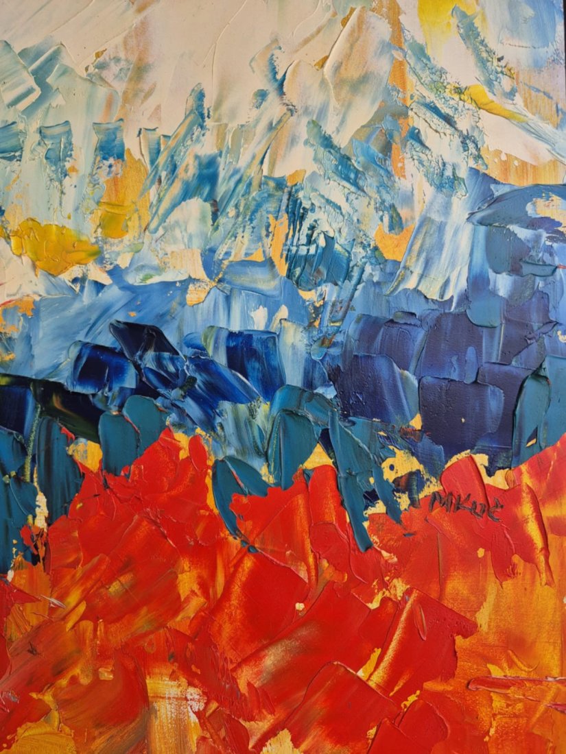 Praca wykonana jest farbami olejnymi na płycie o wymiarach: 50/70 cm. Obraz wymaga oprawy, jest sygnowany z przodu znakiem autorskim. Praca ukazuje abstrakcje o nasyconych barwach. Obrazy w stylu nowoczesnym sprawdzą się zarówno w eleganckim salonie jak i biurze ich forma sprawia, że są uniwersalne i pasują do wielu wnętrz.