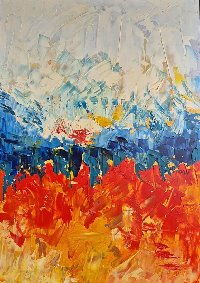 To obraz napięcia. Spokoju, który pęka. Chłodu, który ustępuje miejsca żarowi. Można w nim zobaczyć krajobraz – może góry nad płonącą ziemią – ale równie dobrze to coś wewnętrznego: moment, w którym cisza zamienia się w krzyk. Prawie czuć temperaturę: zimno u góry i palące ciepło na dole.