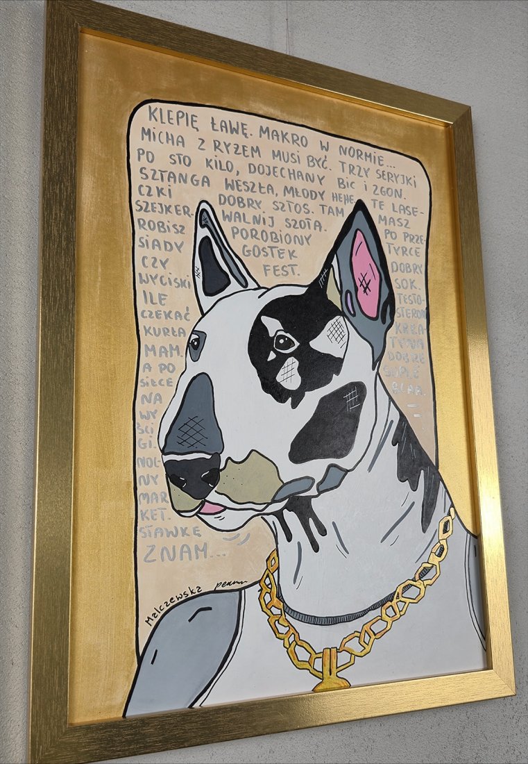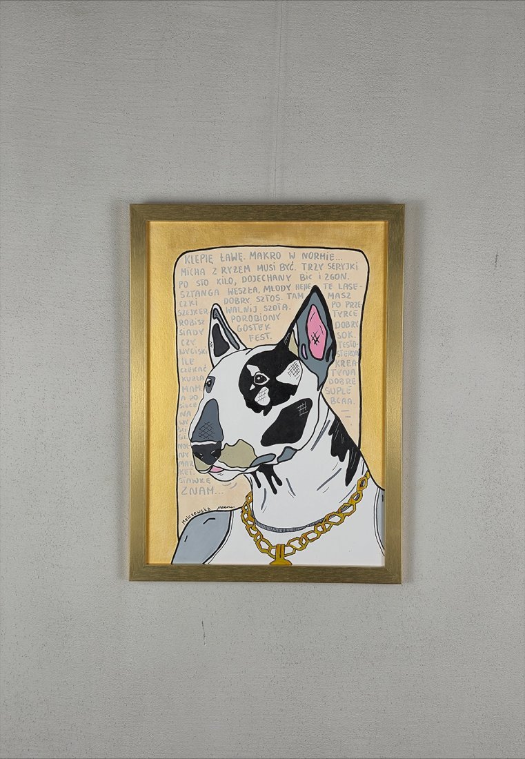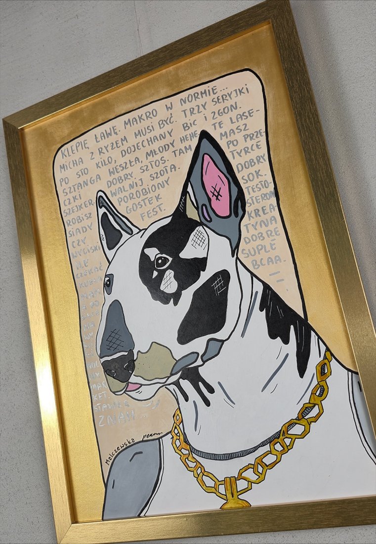Ręcznie malowana grafika / plakat z motywem psa bulteriera.