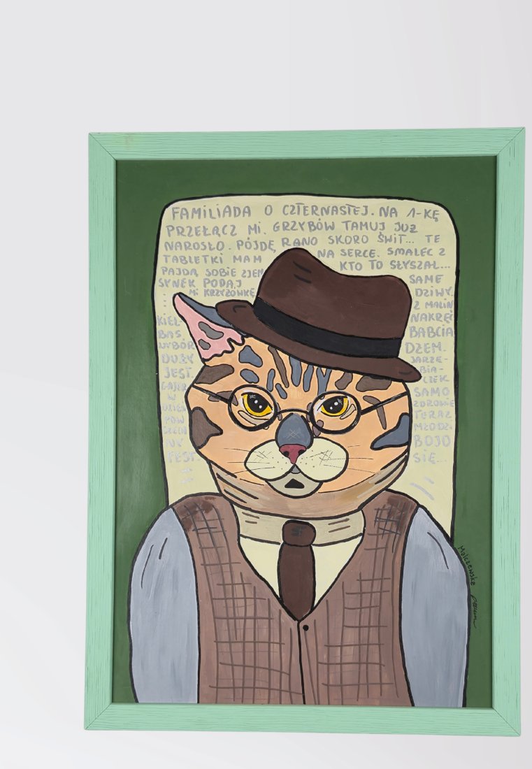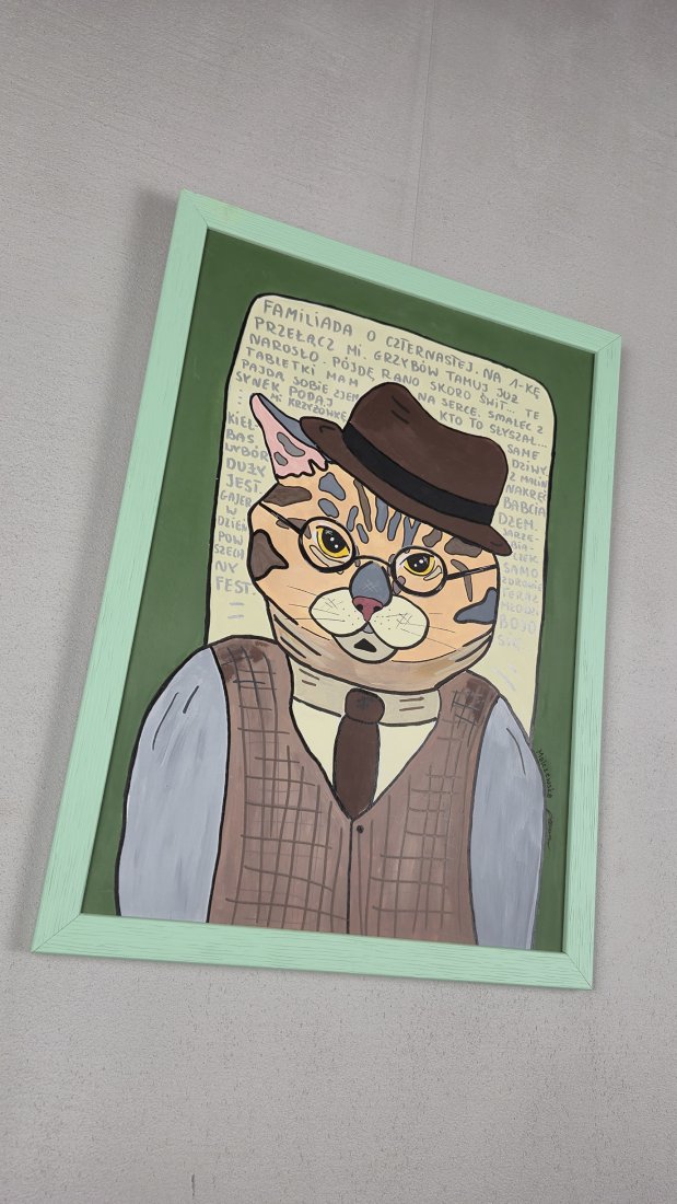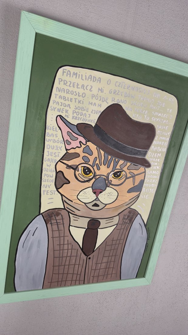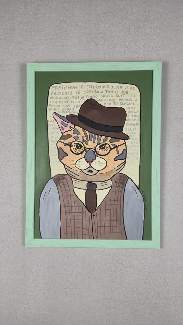 Poznaj kota, który widział już wszystko — a przynajmniej tak twierdzą jego wąsy. W eleganckiej kamizelce, kapeluszu z dawnych lat i z miną znawcy życia, ten "koci dziadek" właśnie zastanawia się, czy zdąży obejrzeć Familiadę o czternastej, czy jednak trzeba iść rano na grzyby, bo podobno już "urodziły".