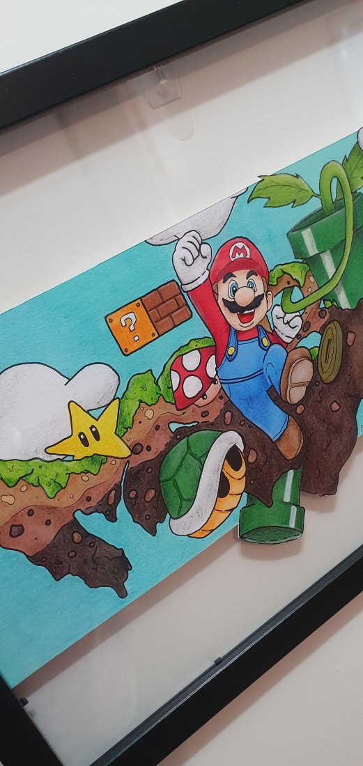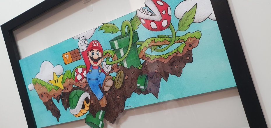 Niepowtarzalny obraz inspirowany światem Super Mario, wykonany ręcznie na przezroczystej płycie pleksi. Dzięki transparentnemu tłu ostateczny efekt zależy od tego, gdzie go powiesisz – ściana staje się częścią kompozycji, tworząc wyjątkową, nowoczesną dekorację wnętrza.